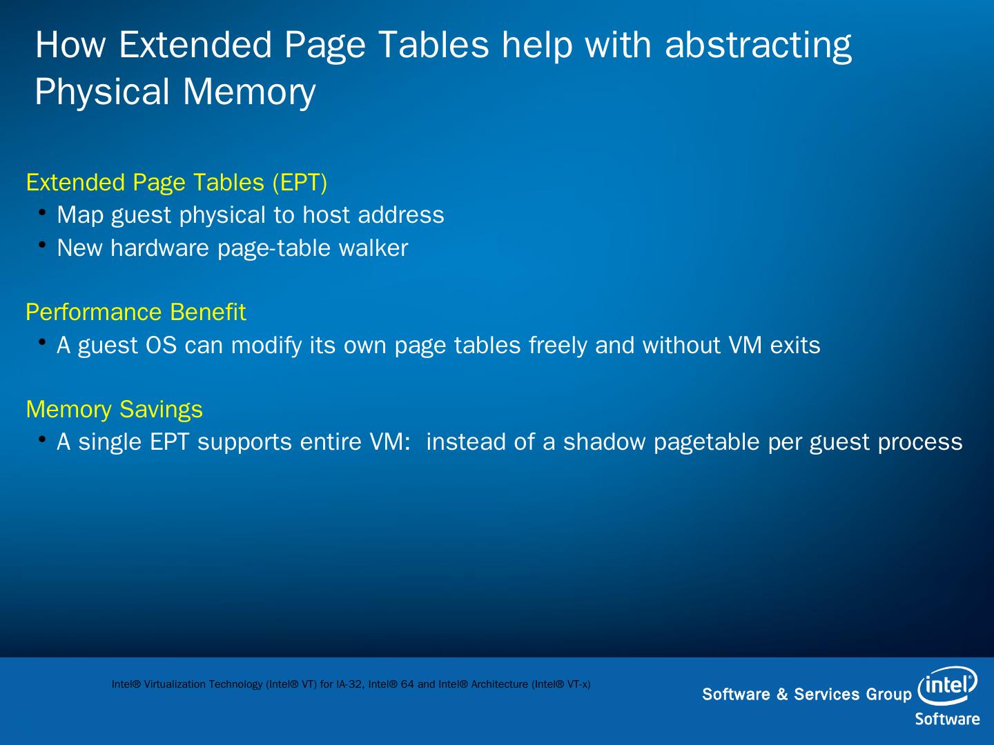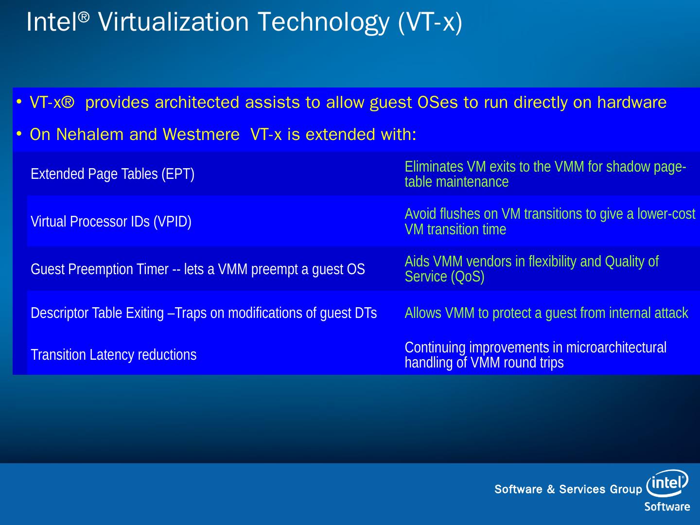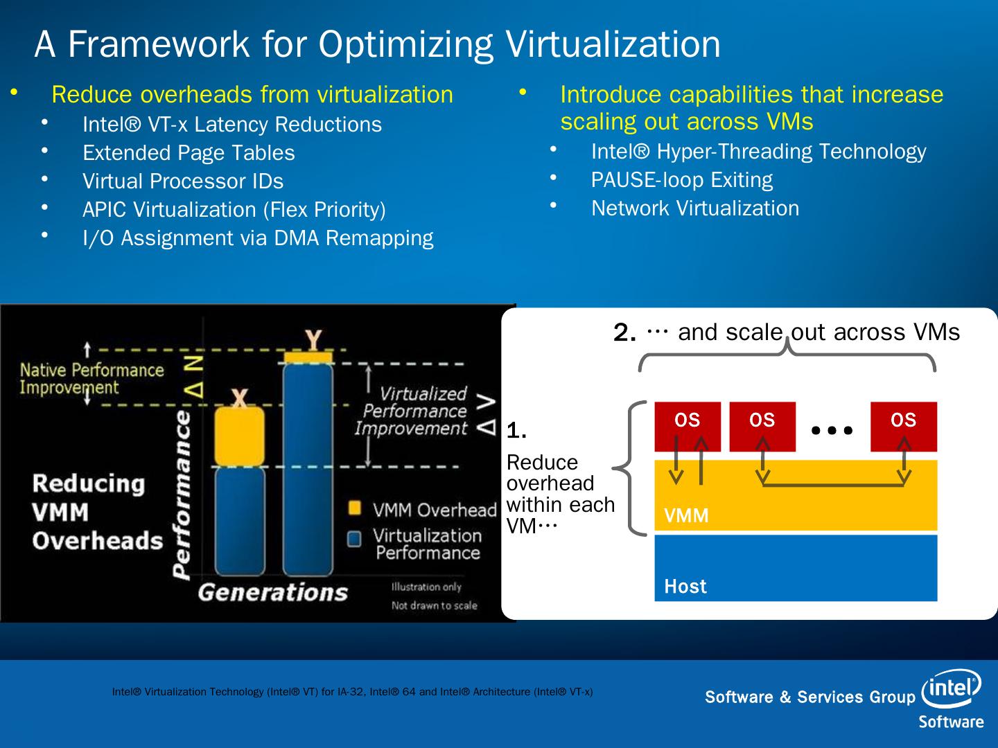 Introduce capabilities that increase scaling out across VMs. Intel® Hyper-Threading Technology; PAUSE-loop Exiting; Network Virtualization. VMM. OS. Host.