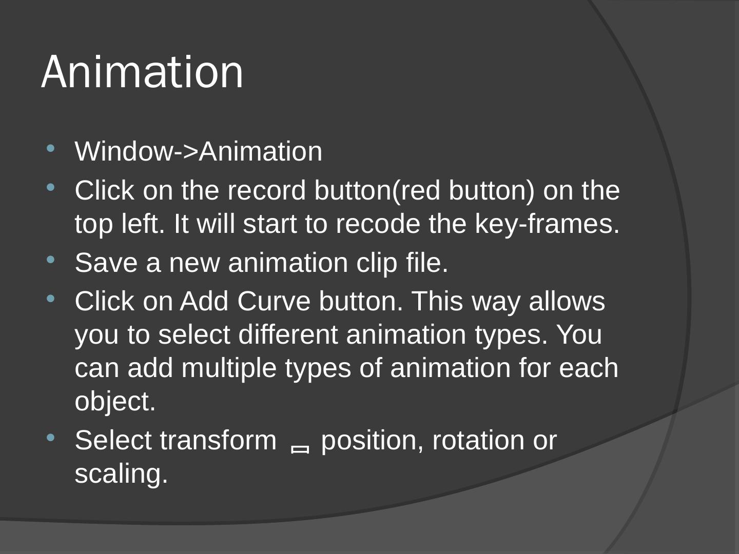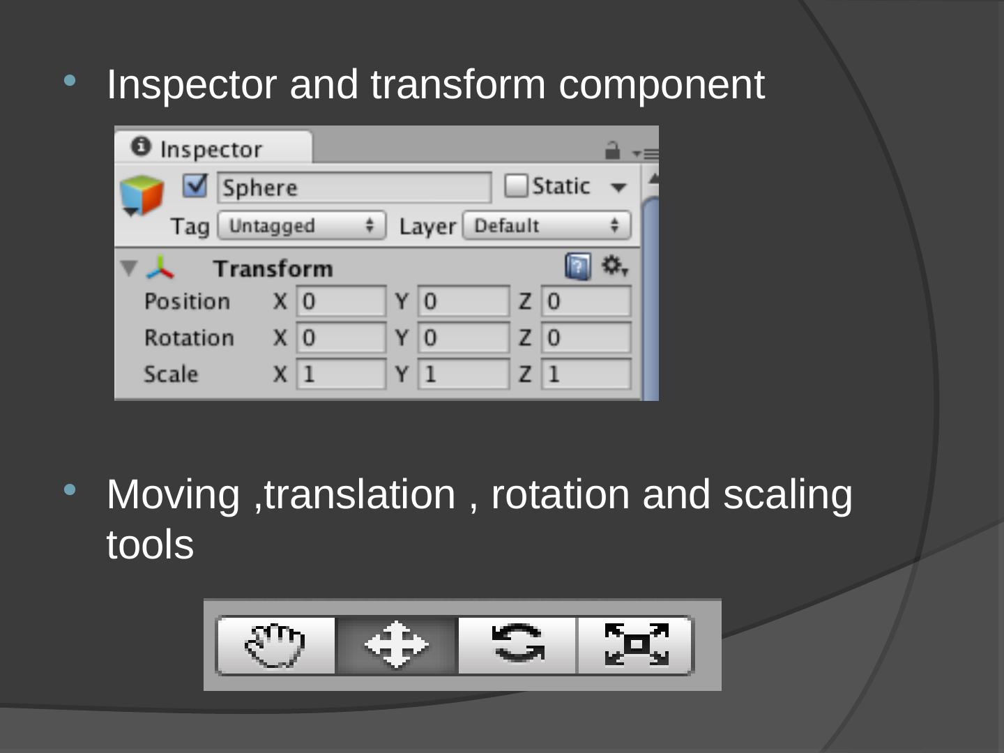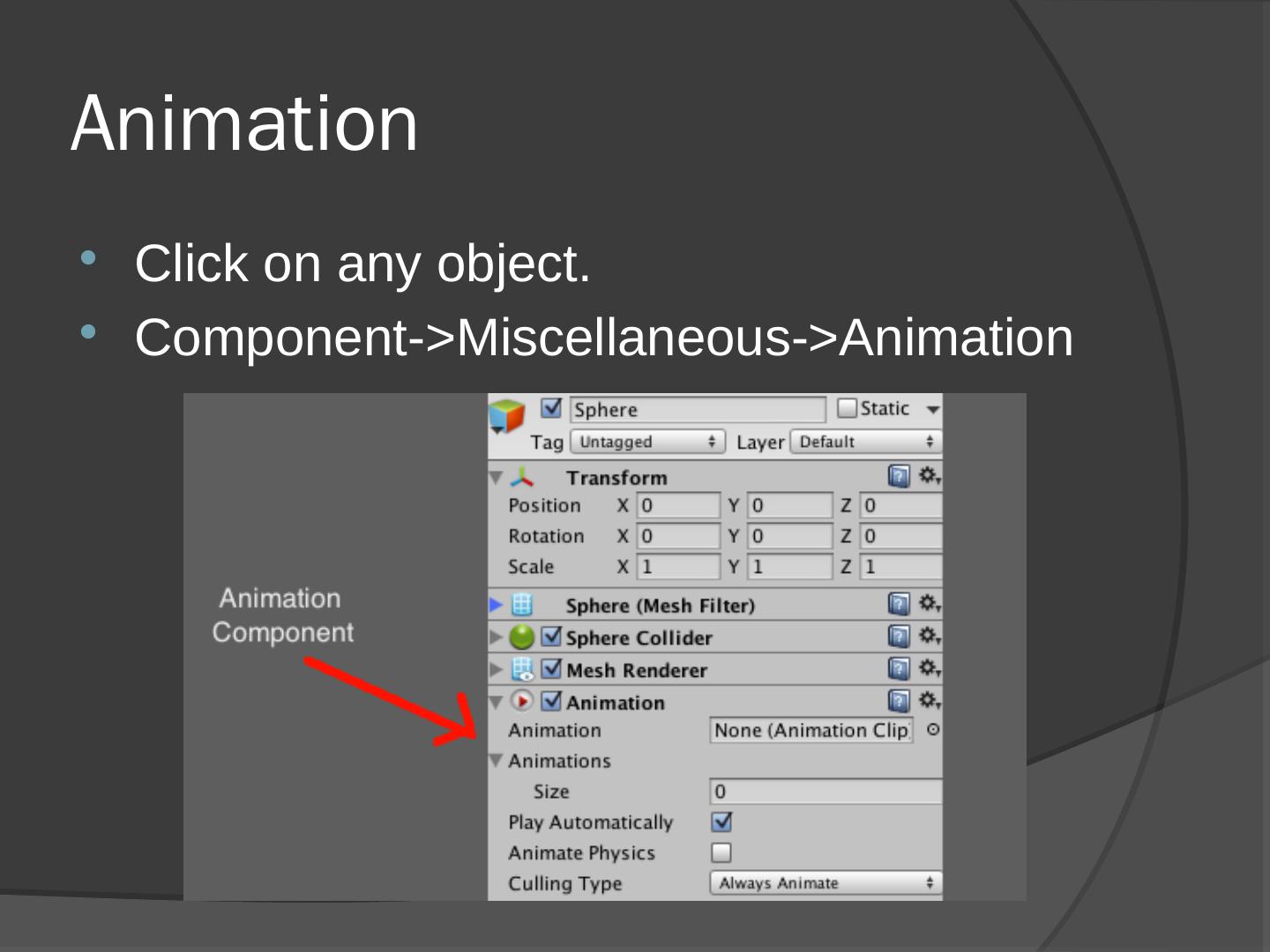 Animation with Unity3D. Kritsakorn Chaumpanich. Object Creation. GameObject->Create Other ->Sphere. Inspector and transform component.