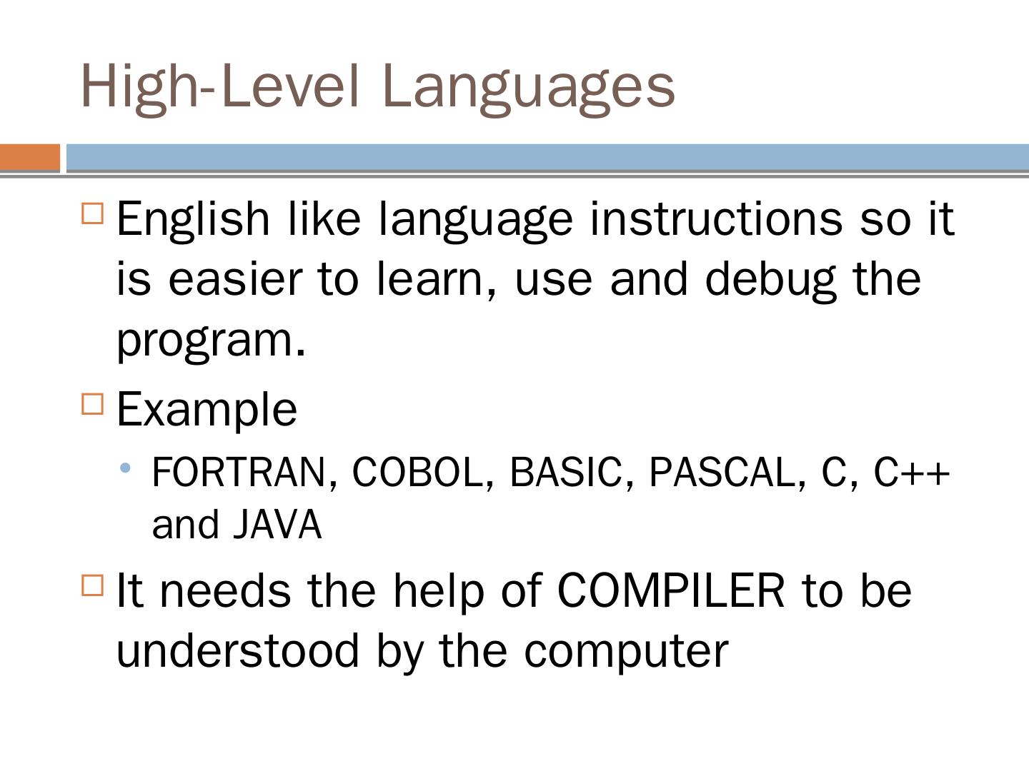 FORTRAN, COBOL, BASIC, PASCAL, C, C++ and JAVA. It needs the help of COMPILER to be understood by the computer. What is Compiler. Translates the ...