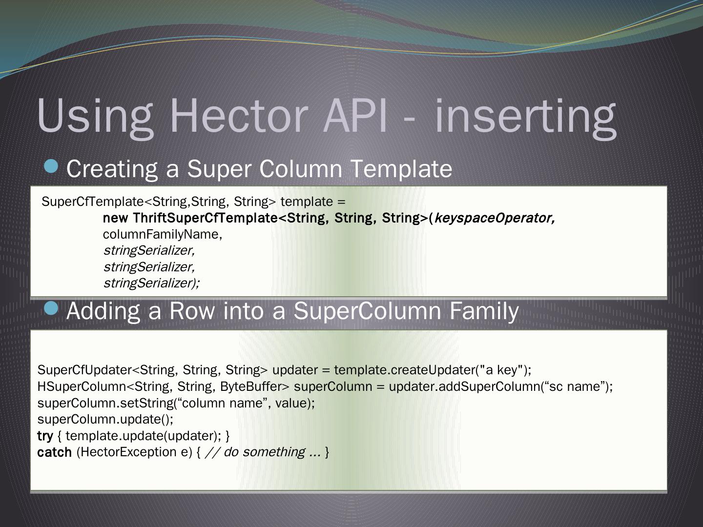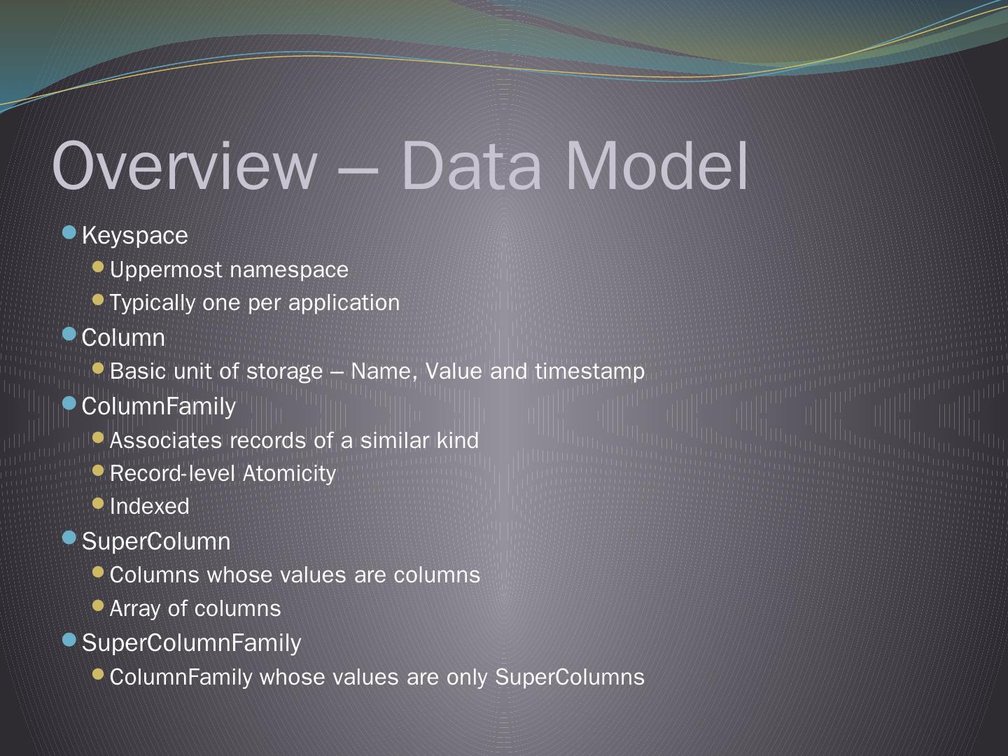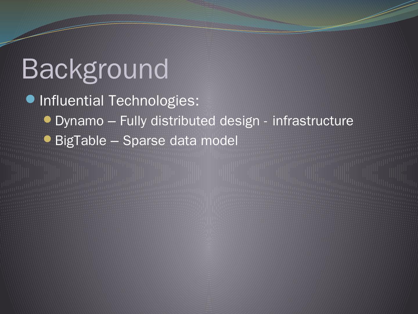 Cassandra DB. Not Only SQL. Table of Content. Background and history; Used Applications; What is Cassandra? – Overview; Replication & Consistency ...