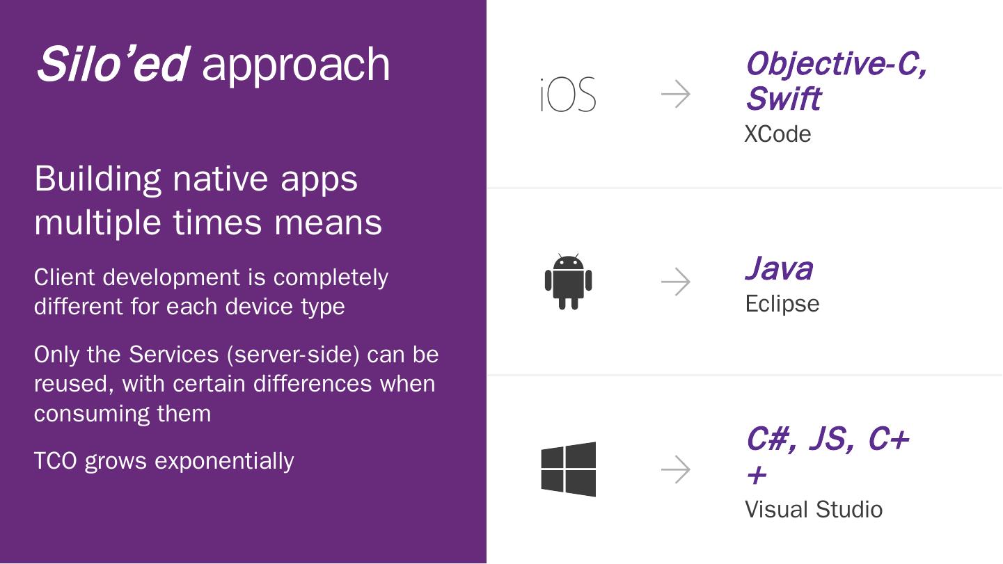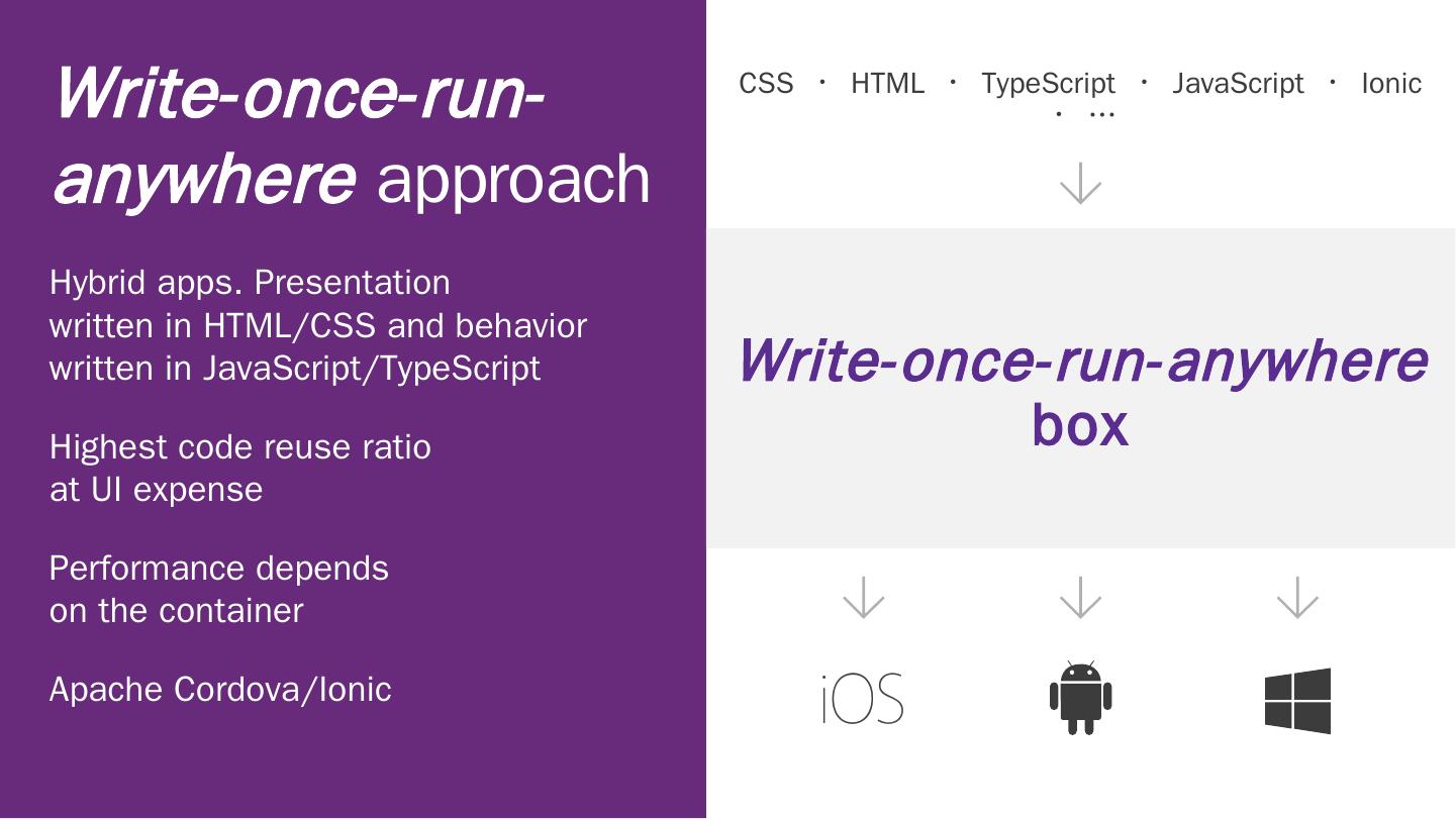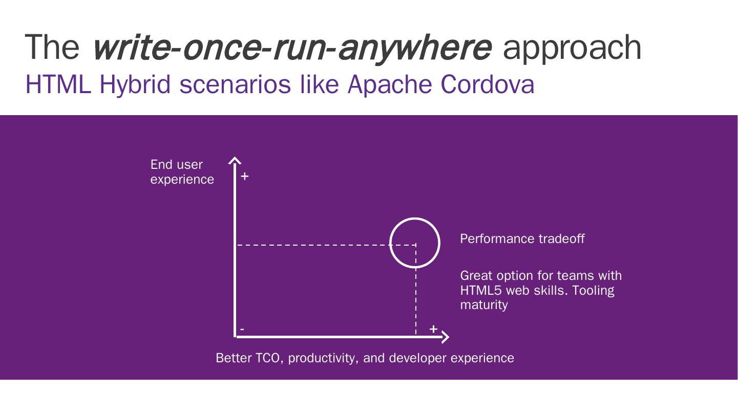 HTML Hybrid scenarios like Apache Cordova. End user. experience. Performance tradeoff. Great option for teams with HTML5 web skills. Tooling maturity.