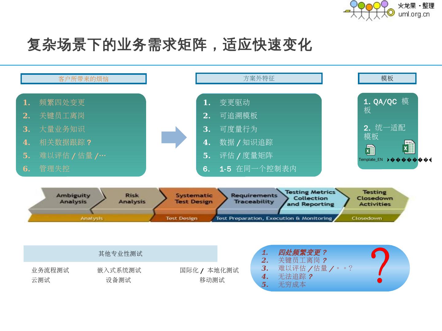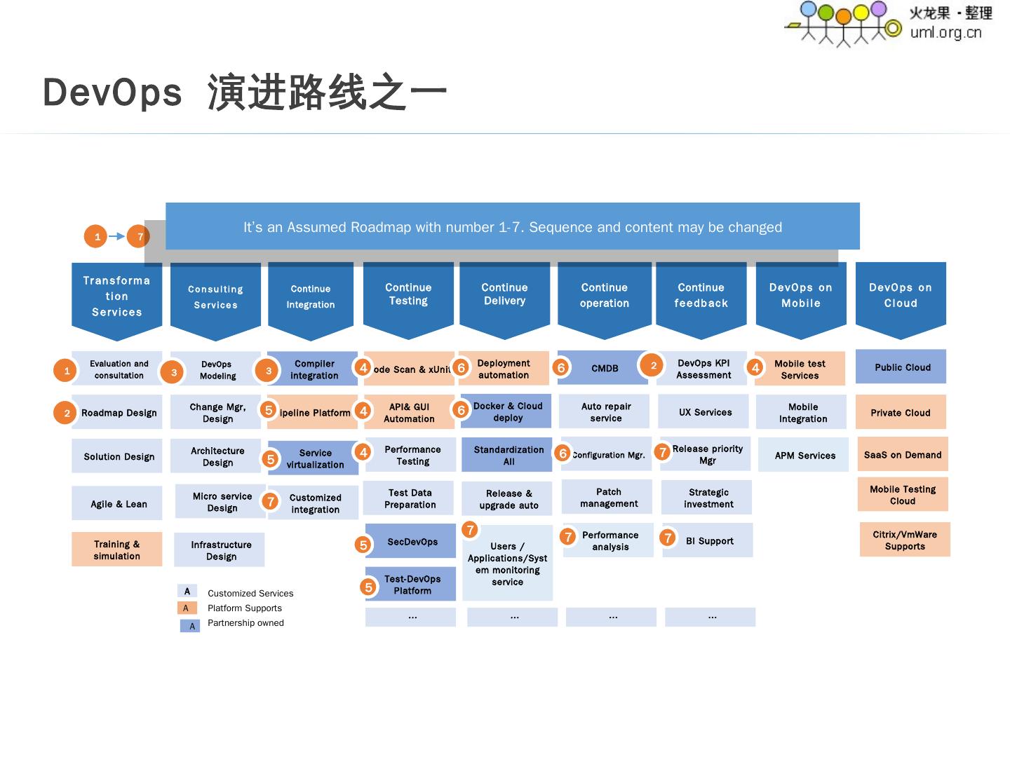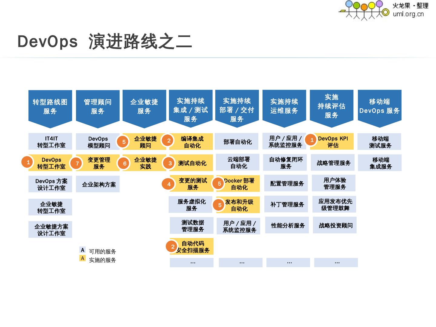 6 .DevOps 转型工作室 IT4IT 转型工作室 DevOps 方案 设计工作室 DevOps 模型顾问 变更管理 服务 企业敏捷 顾问 企业敏捷 实践 编译集成 自动化 测试自动化 变更的测试 服务 服务虚拟化 服务 测试数据 管理服务 自动代码 安全扫描服务 … 部署自动化 发布和升级 自动化 云端部署 自动化 … 用户 / 应用 / 系统监控服务 自动修复闭环服务 配置管理服务 补丁管理服务 Docker 部署 自动化 … 性能分析服务 DevOps KPI 评估 战略管理服务 用户体验 管理服务 应用发布优先级管理鼓舞 … 战略投资顾问 移动端 测试服务 移动端 集成服务 企业架构方案 企业敏捷 转型工作室 企业敏捷方案设计工作室 用户 / 应用 / 系统监控服务 1 2 3 4 5 6 7 企业敏捷 服务 转型路线图 服务 管理顾问 服务 实施持续 集成 / 测试 服务 实施持续 部署 / 交付 服务 实施持续 运维服务 实施 持续评估 服务 移动端 DevOps 服务 A A 可用的服务 实施的服务 DevOps 演进路线之二 18 2 5 5 1