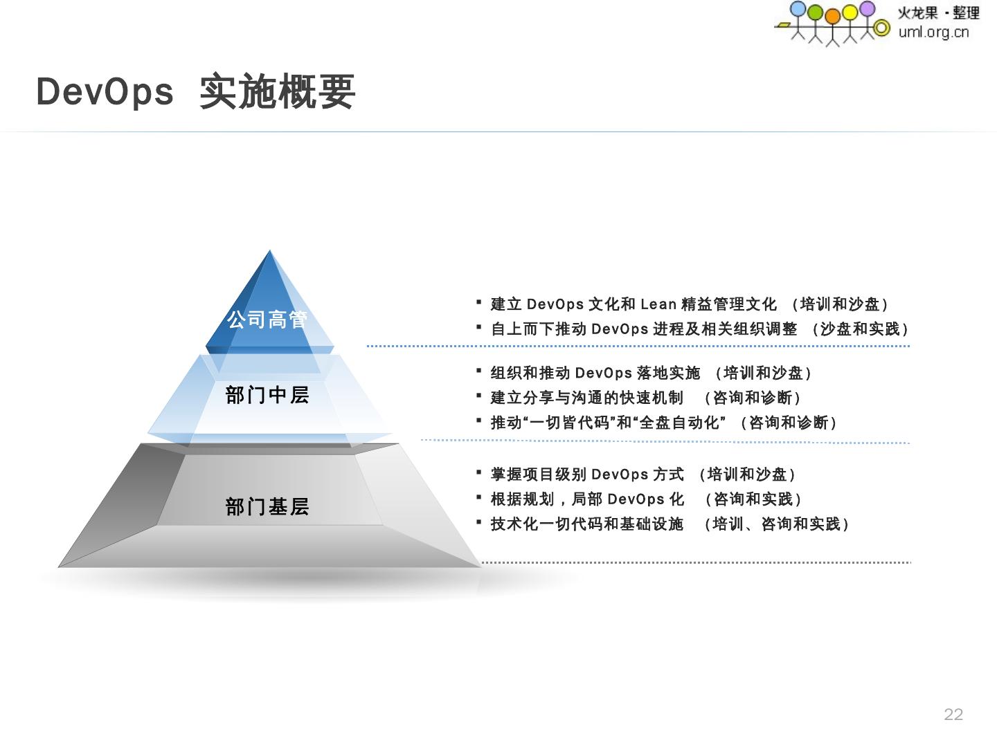 10 .DevOps 实施概要 22 公司高管 部门中层 部门基层 组织和推动 DevOps 落地实施 (培训和沙盘) 建立分享与沟通的快速机制 (咨询和诊断) 推动“一切皆代码”和“全盘自动化” (咨询和诊断) 掌握项目级别 DevOps 方式 (培训和沙盘) 根据规划,局部 DevOps 化 (咨询和实践) 技术化一切代码和基础设施 (培训、咨询和实践) 建立 DevOps 文化和 Lean 精益管理文化 (培训和沙盘) 自上而下推动 DevOps 进程及相关组织调整 (沙盘和实践)