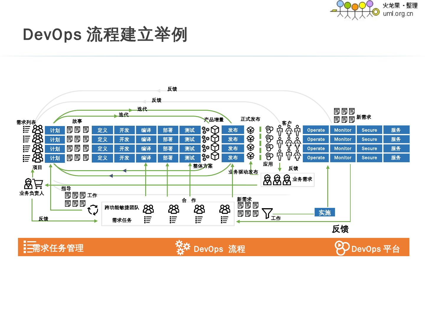 22 .定义 开发 编译 部署 测试 定义 开发 编译 部署 测试 定义 开发 编译 部署 测试 定义 开发 编译 部署 测试 计划 计划 计划 计划 发布 发布 发布 发布 Operate Monitor Secure 服务 Operate Monitor Secure 服务 Operate Monitor Secure 服务 Operate Monitor Secure 服务 需求列表 项目 故事 整体方案 正式发布 应用 客户 跨功能敏捷团队 需求任务 业务负责人 需求任务管理 DevOps 流程 DevOps 平台 工作 产品增量 业务需求 业务驱动发布 反馈 反馈 反馈 合作 迭代 迭代 新需求 反馈 新需求 工作 反馈 实施 指导 DevOps 流程建立举例 23