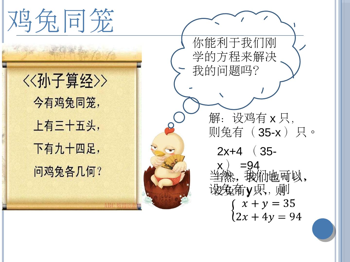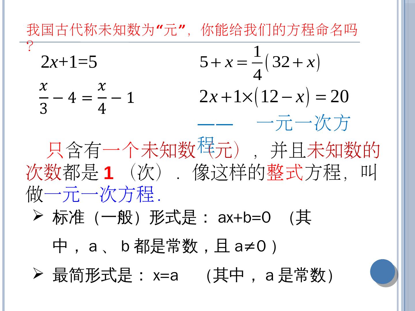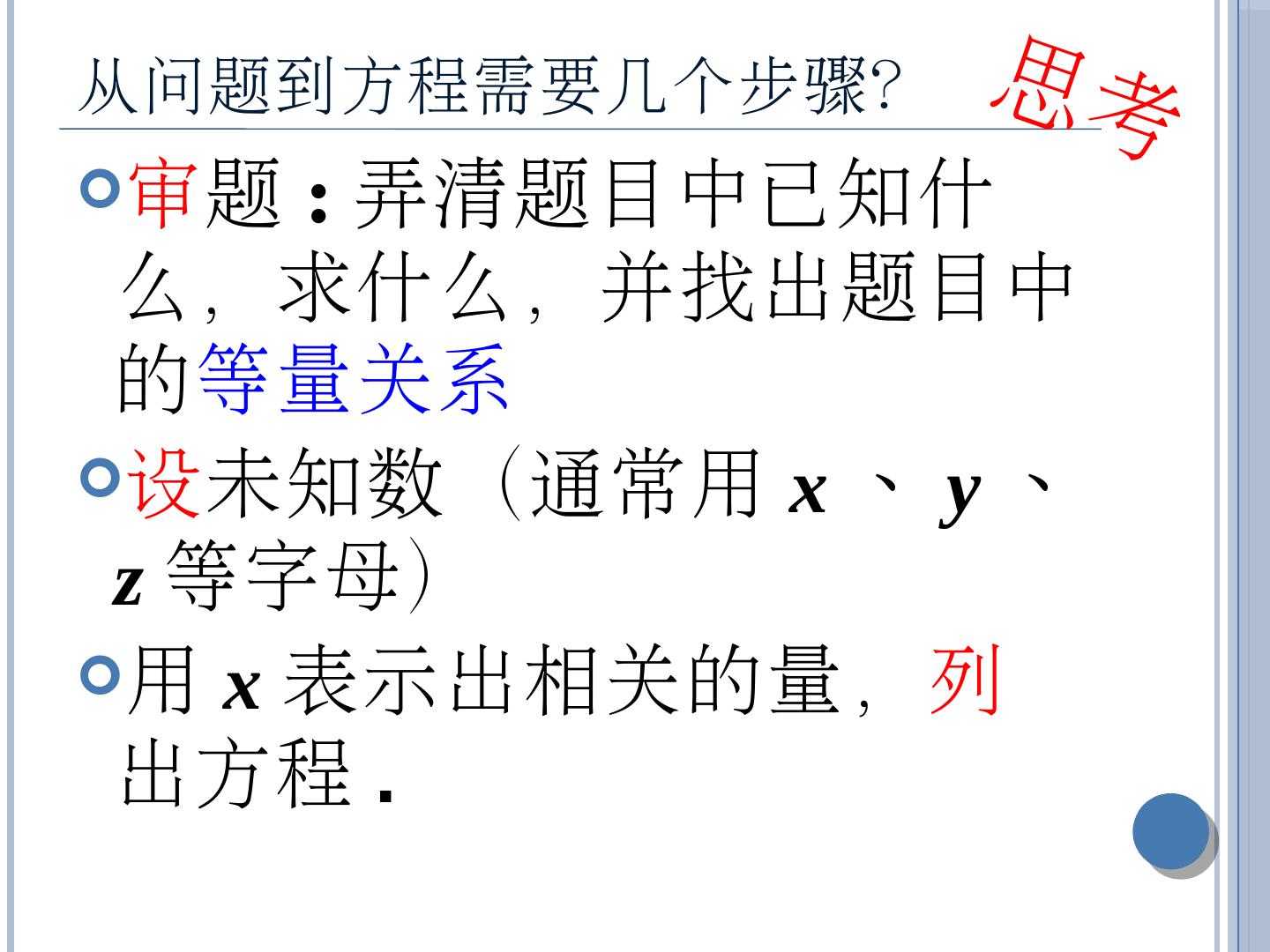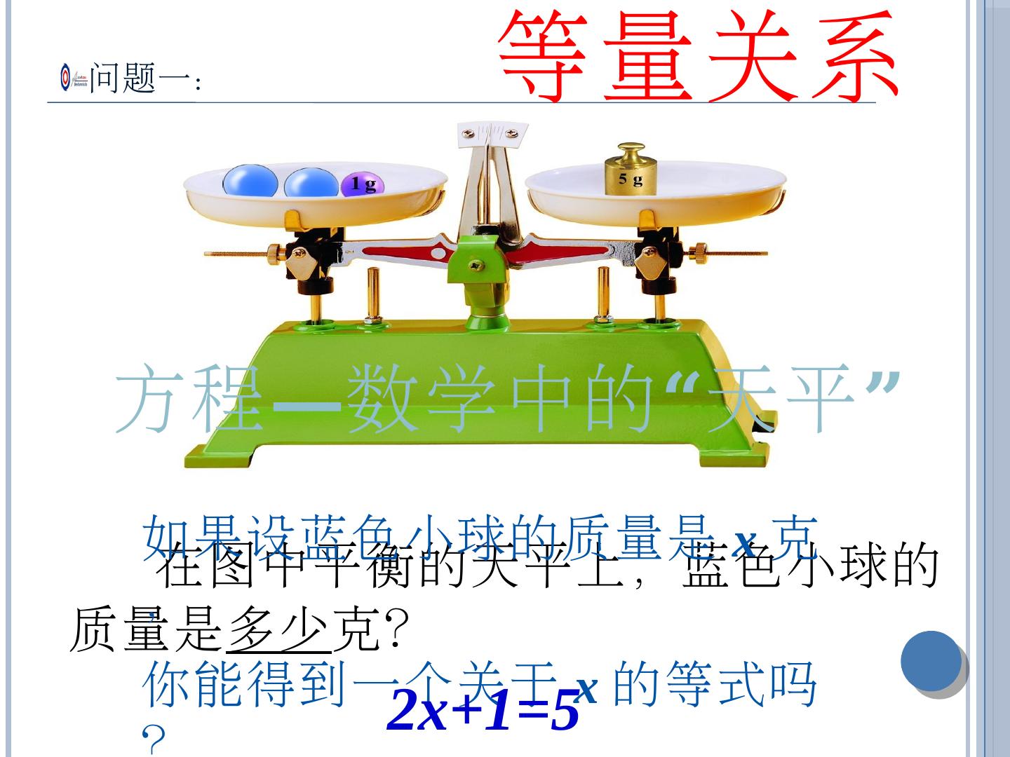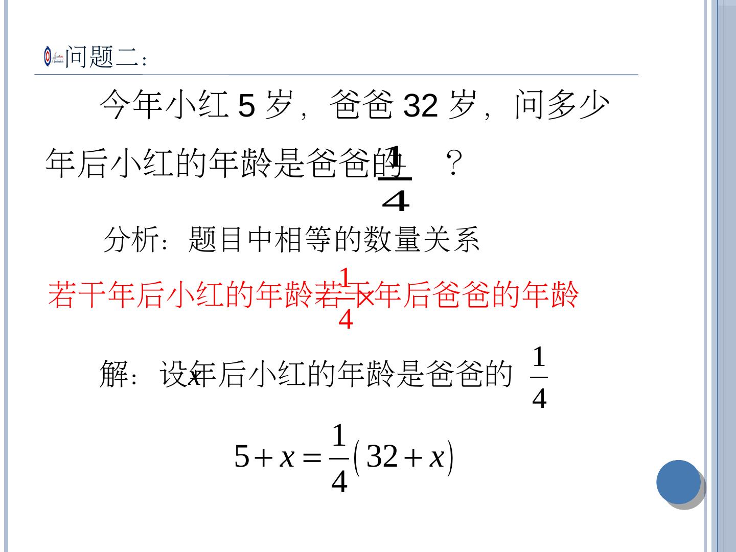 等量关系. 问题二:. 今年小红5岁,爸爸32岁,问多少年后小红的年龄是爸爸的 ? .... 把所有的数学问题转化为. 代数问题. ;. 最后. ,. 把所有的代数问题转化为. 解方程 。