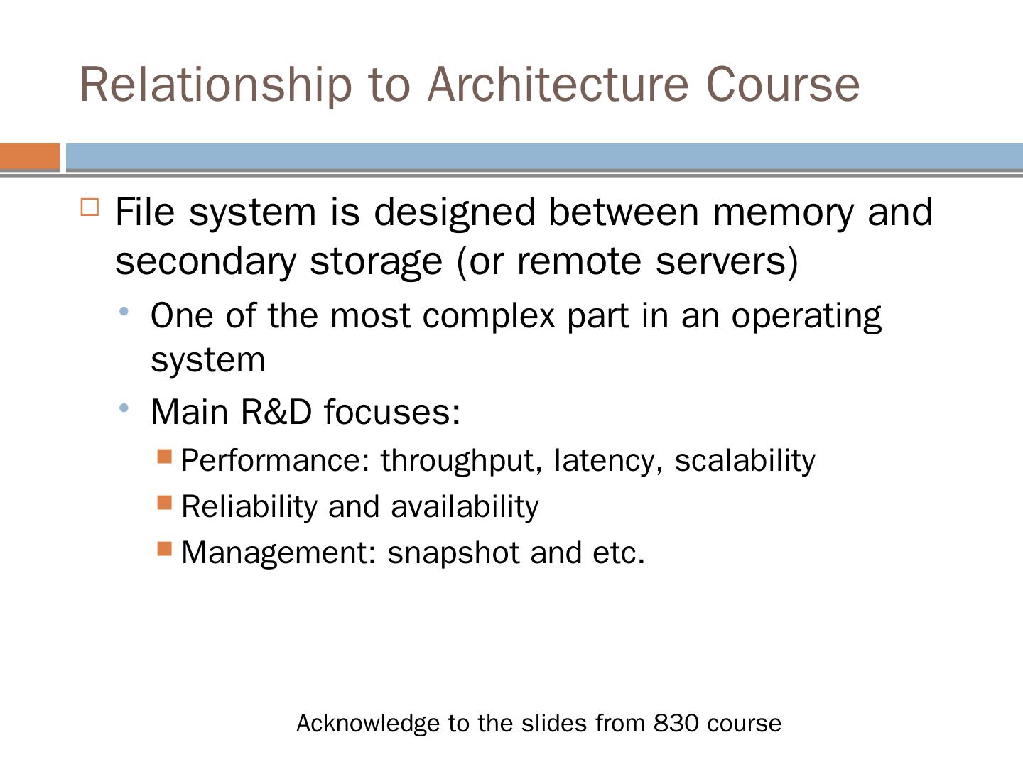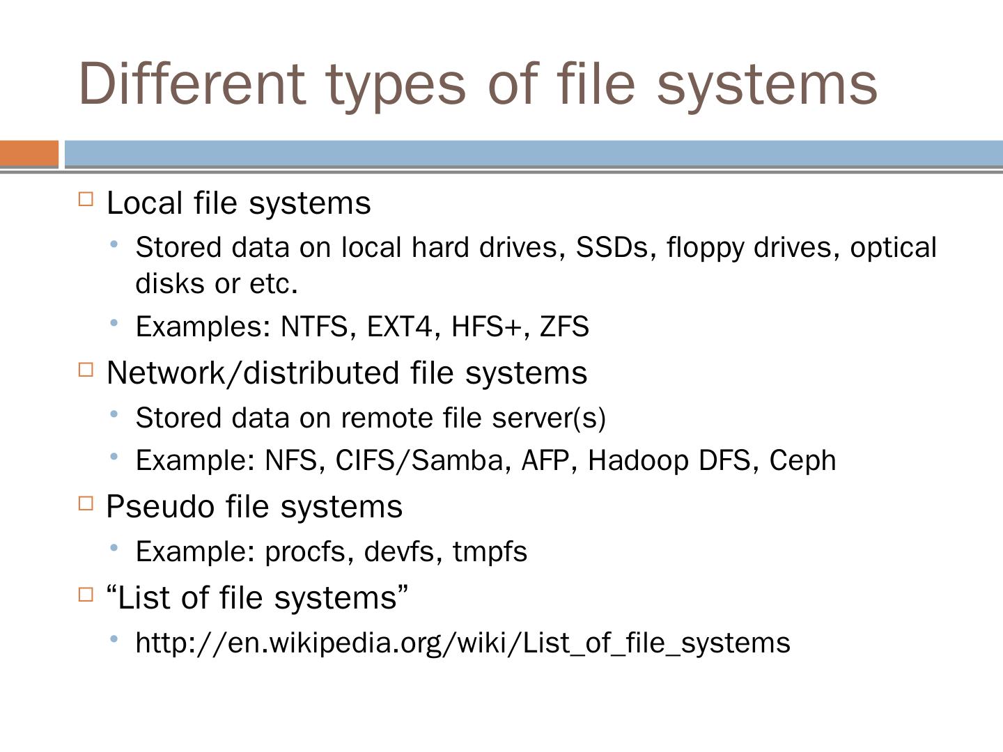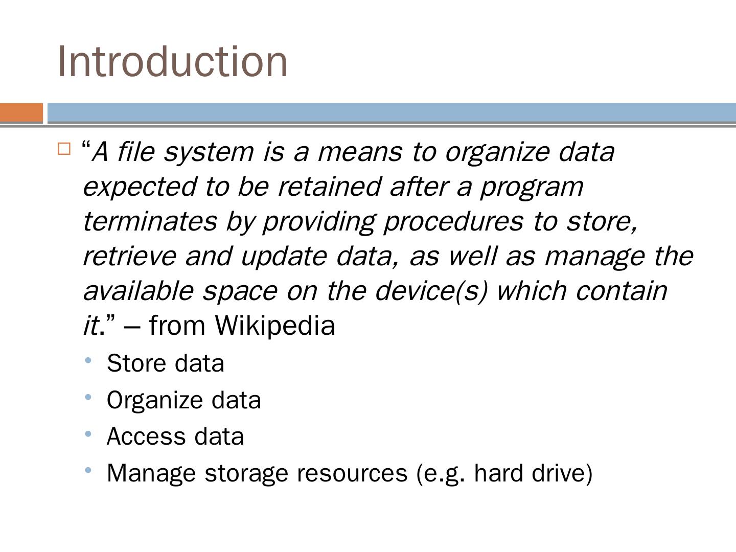 File system is designed between memory and secondary storage (or remote .... Google File System, a special distributed file system for special requirements.