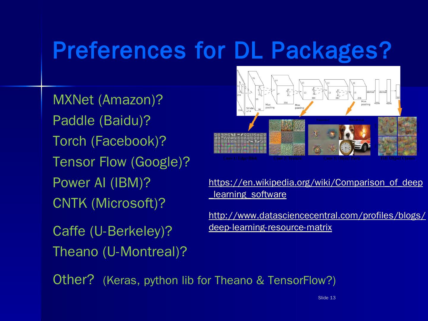 MXNet (Amazon)?. Paddle (Baidu)?. Torch (Facebook)?. Tensor Flow (Google)?. Power AI (IBM)?. CNTK (Microsoft)?. Caffe (U-Berkeley)?. Theano (U-Montreal)?.