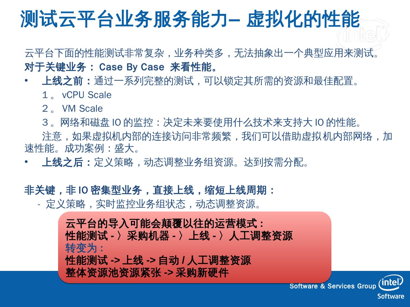 资源池层面:需要有一个共享存储去集中管理虚拟机/业务镜像。另外可能需要 ... 测试管理平台的管理能力– 管理平台性能; 测试云平台业务服务能力– 虚拟化的性能. 6.