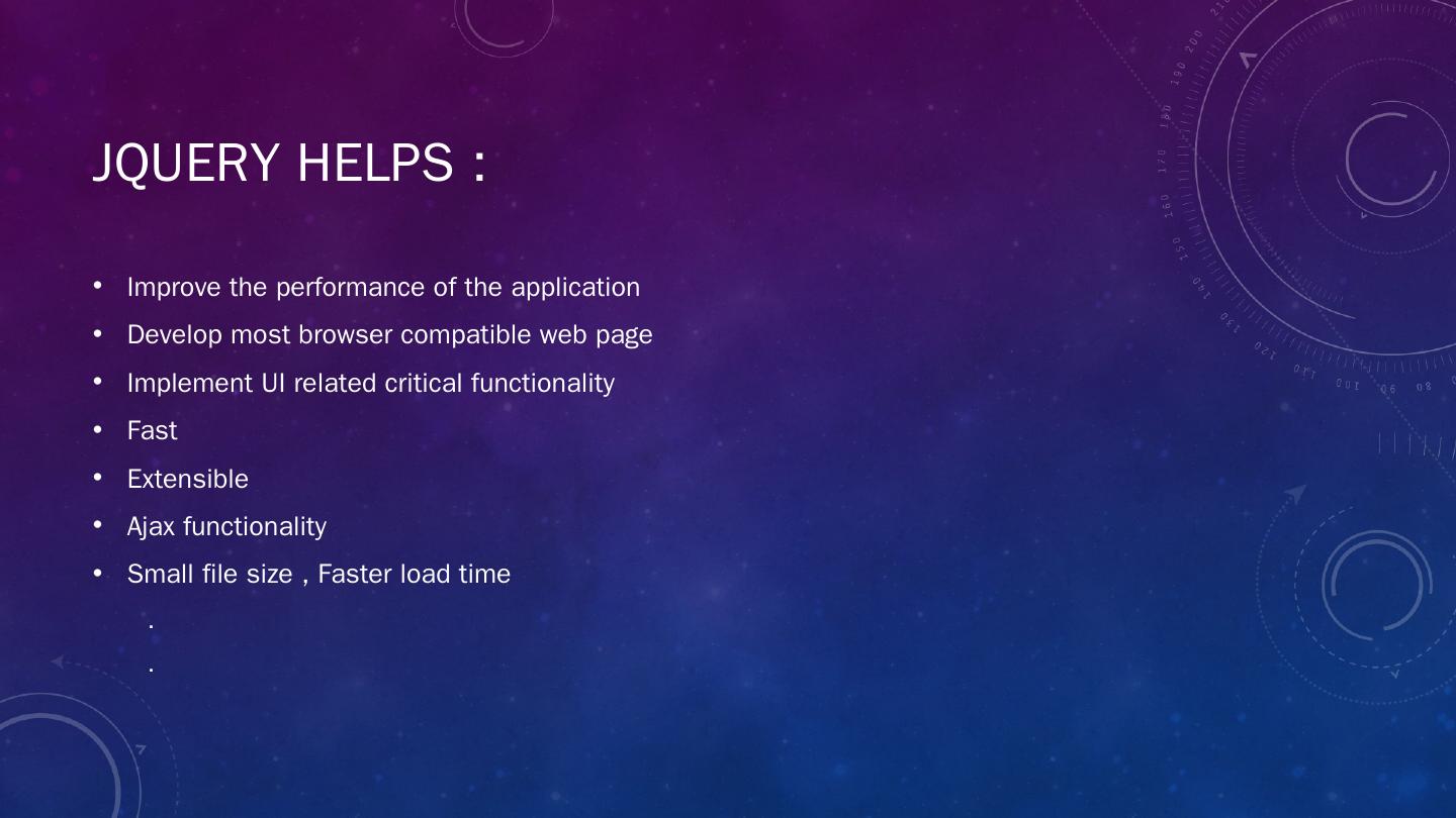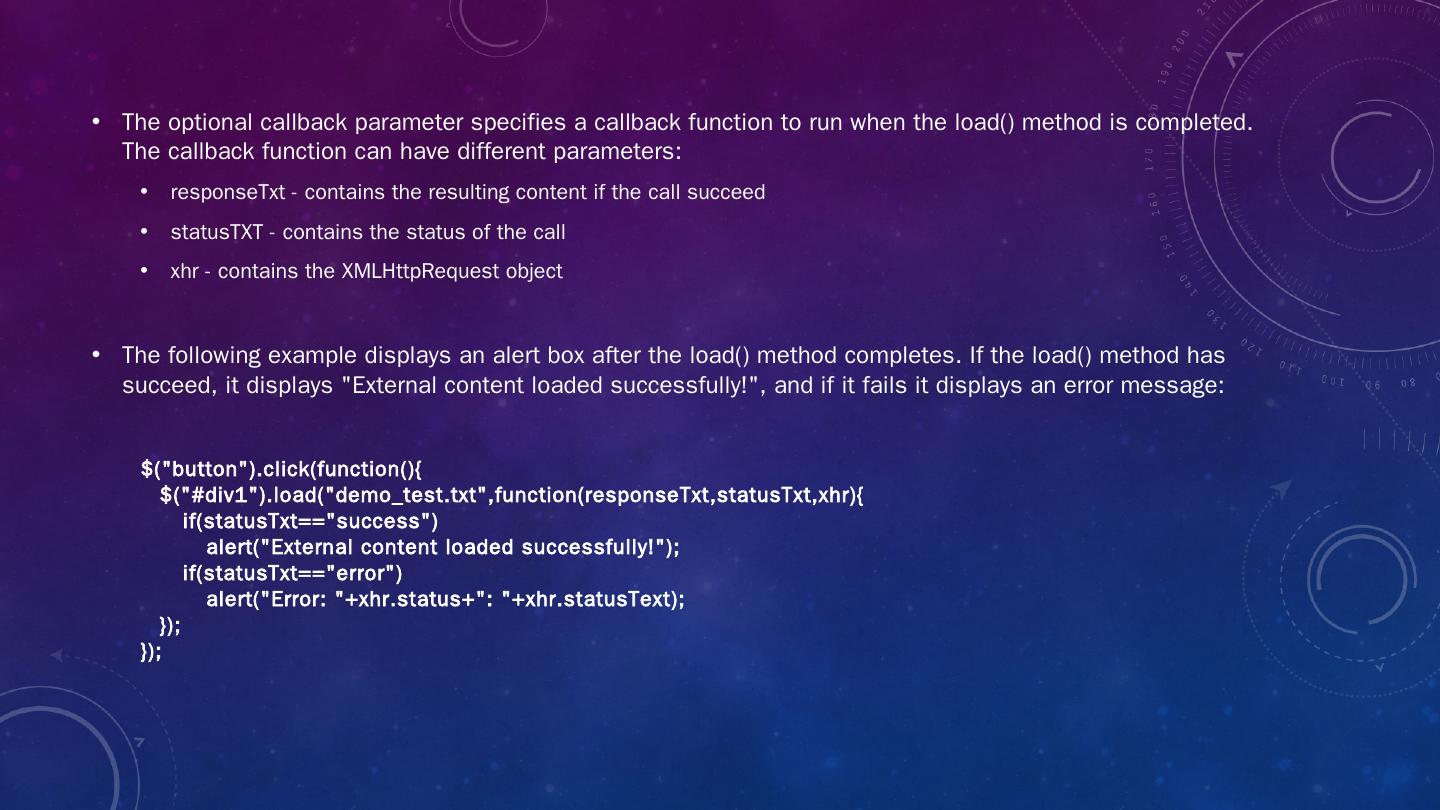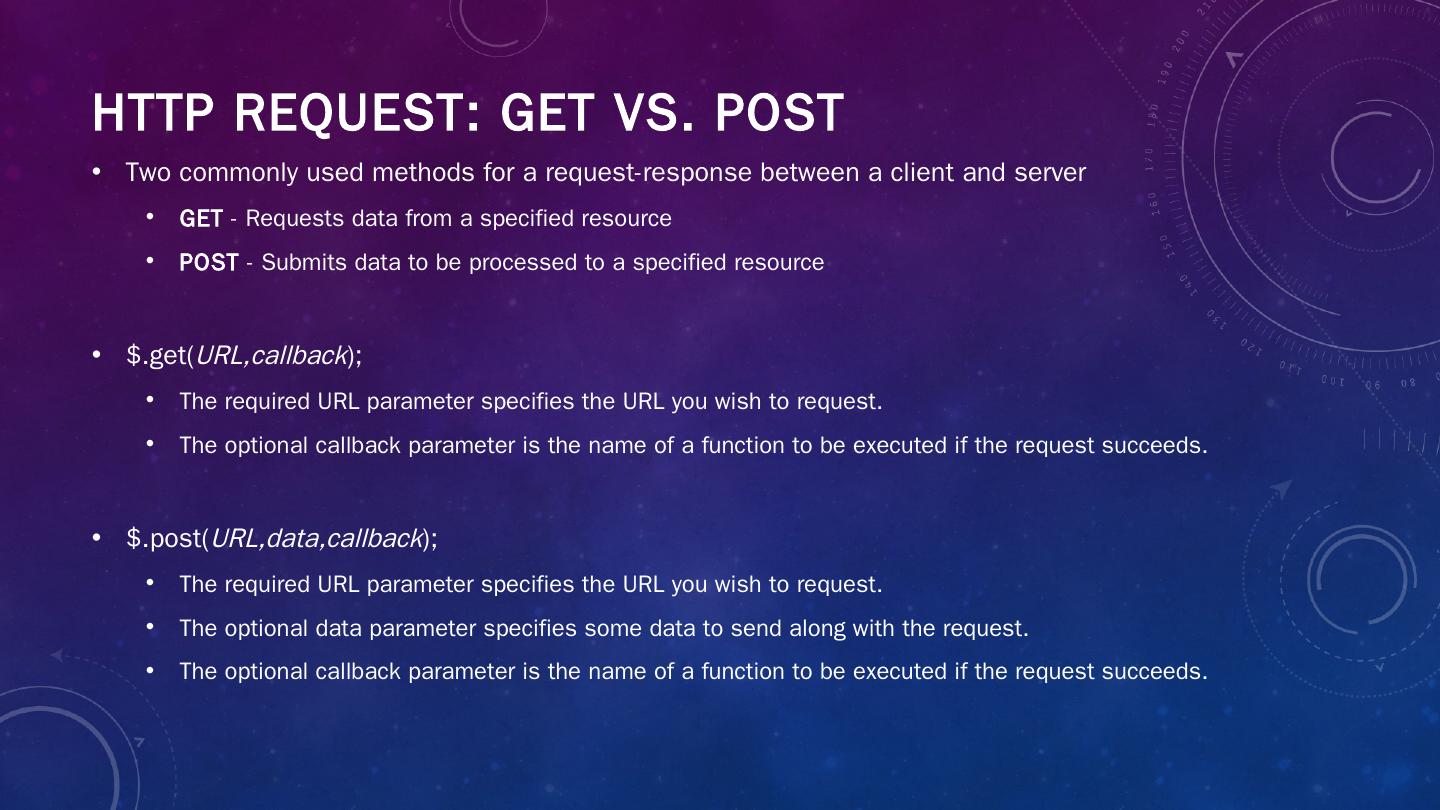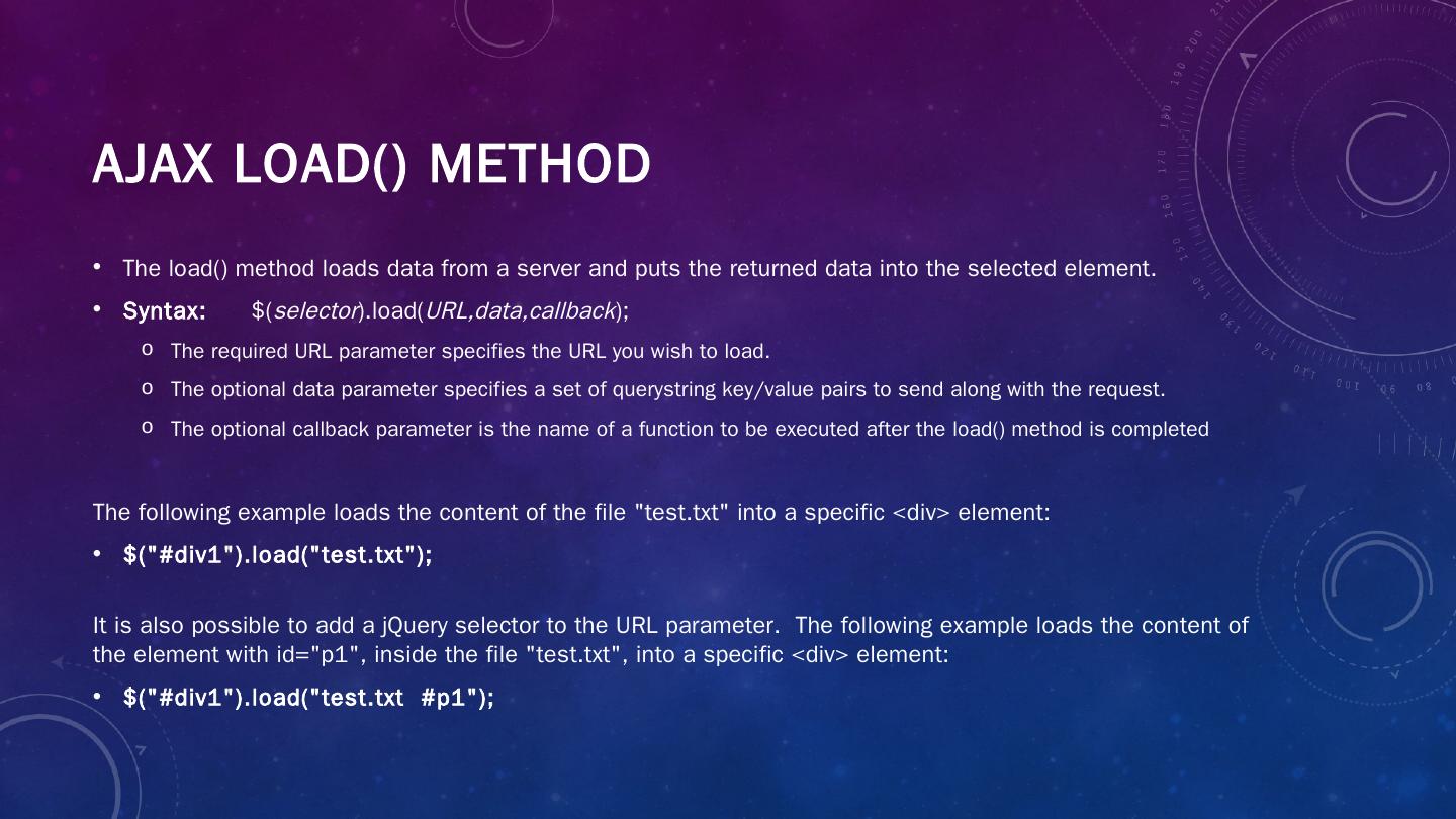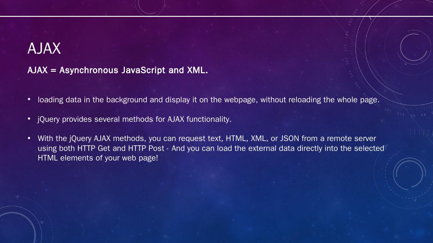 With the jQuery AJAX methods, you can request text, HTML, XML, or JSON from a remote server using both HTTP Get and HTTP Post - And you can load the ...
