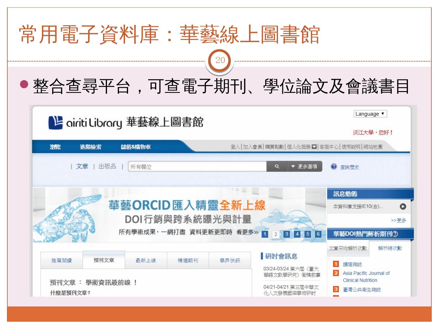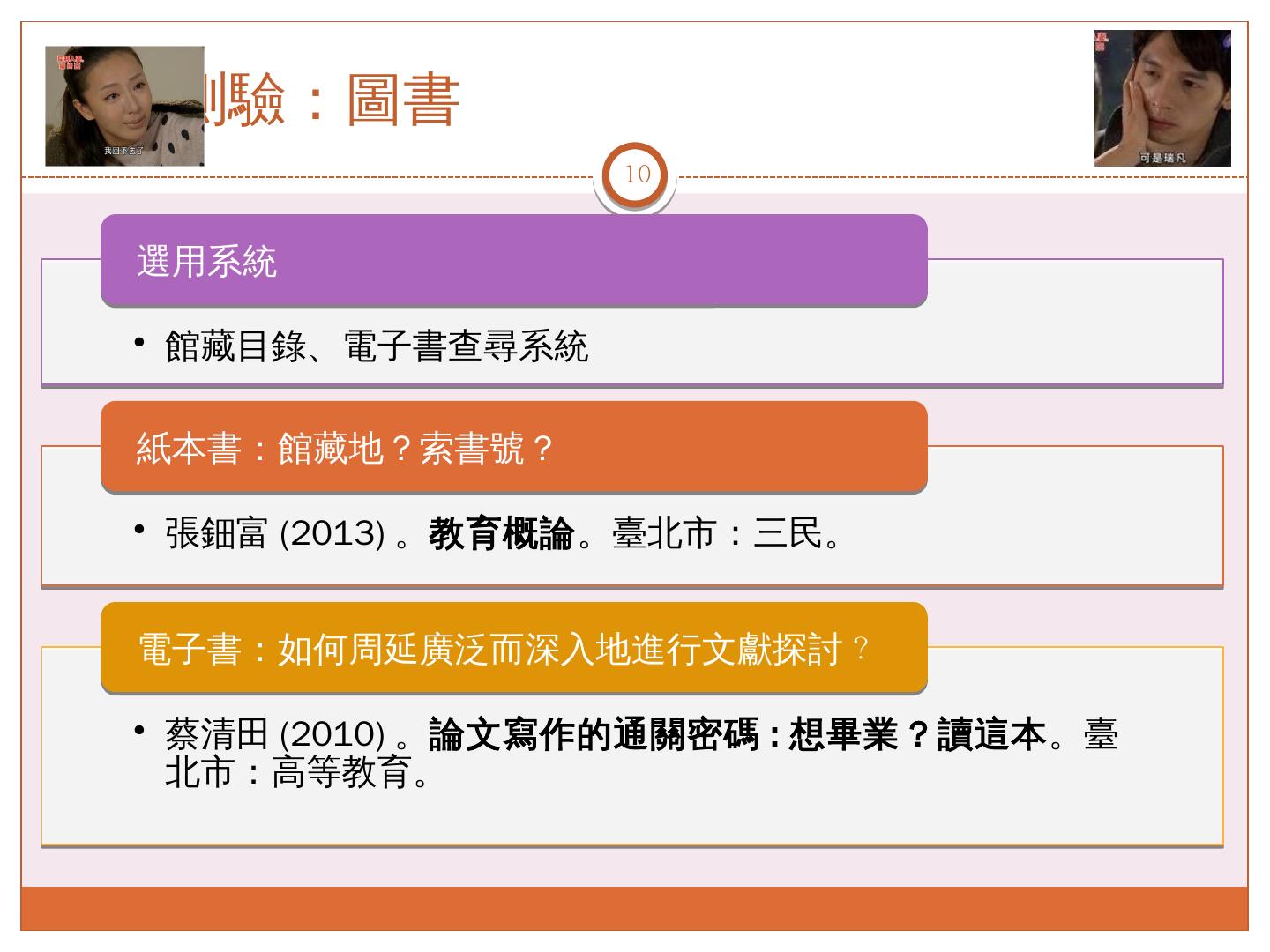 教育概論。臺北市: ... 選用系統. 張鈿富(2013)。教育概論。臺北市:三民。 紙本書:館藏地?索書號 .... 常用電子資料庫:中國學位論文全文數據庫. 26.