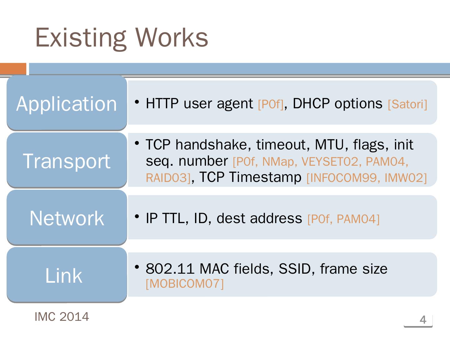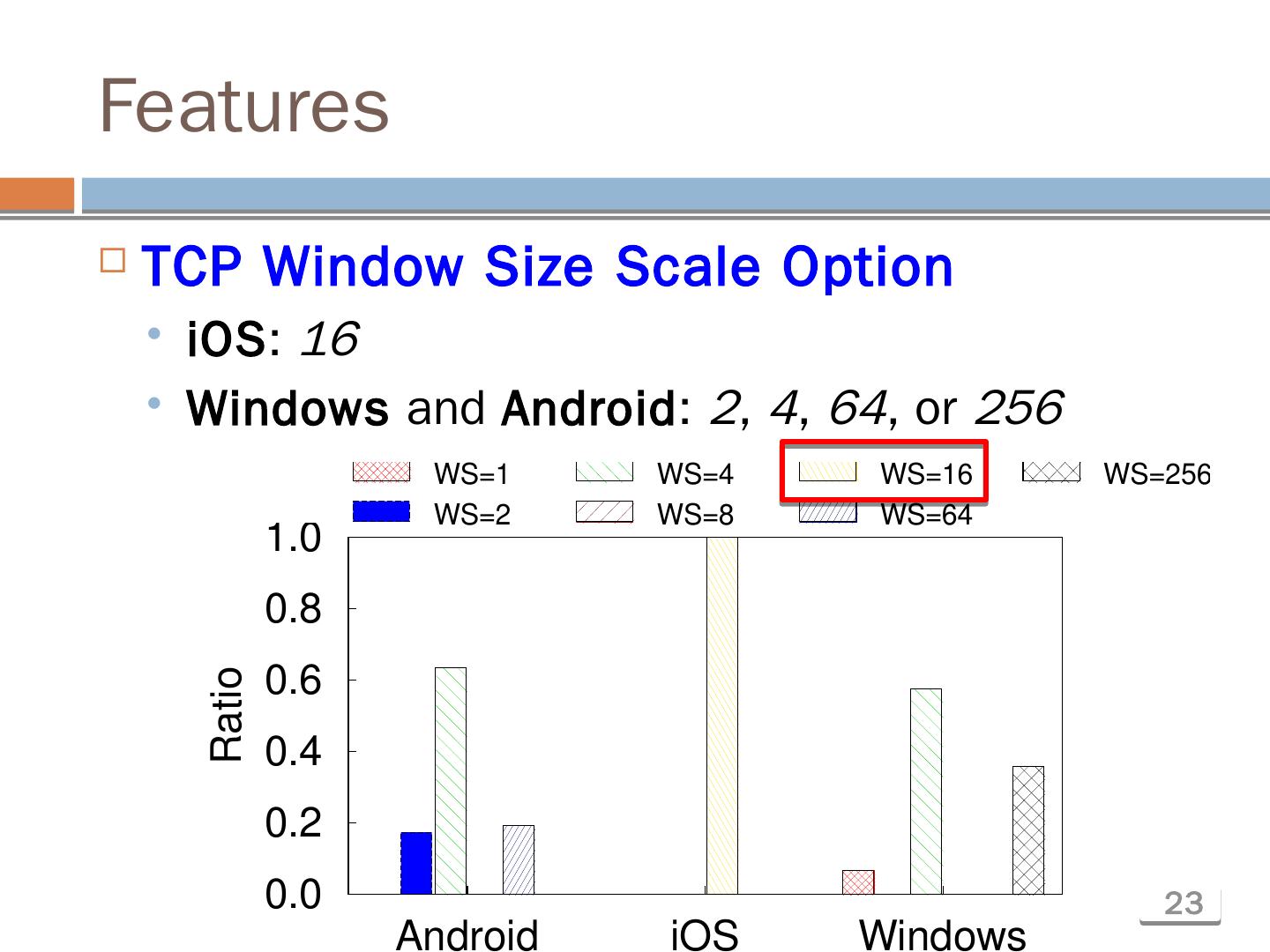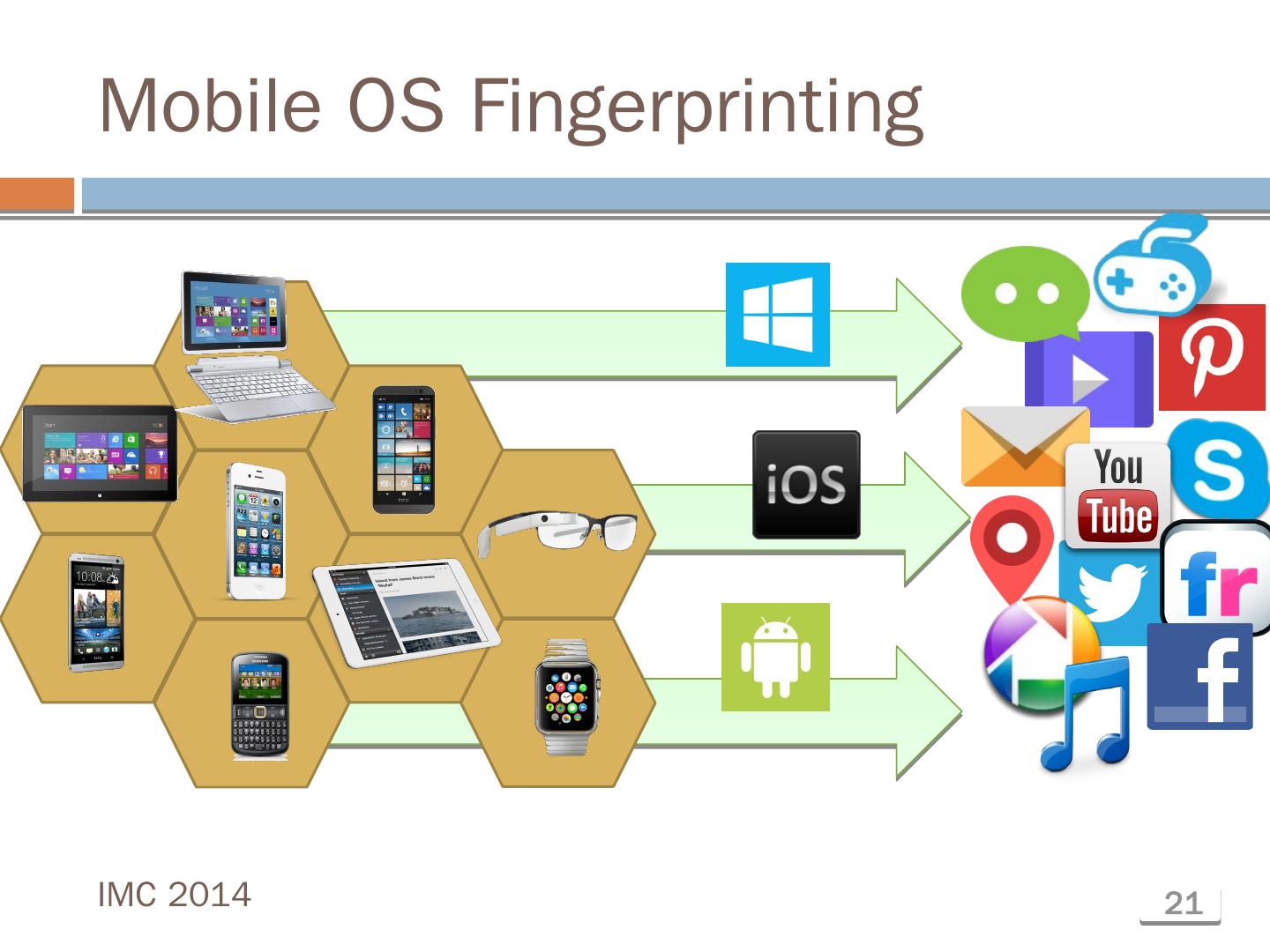 10 iOS traces. iPhone 4s, iPhone5s, iPad 2, iPod Touch; iOS 5.1.1, iOS 6.1. 32 Windows laptops traces. running Windows XP or Windows 7. Each capture lasts ...
