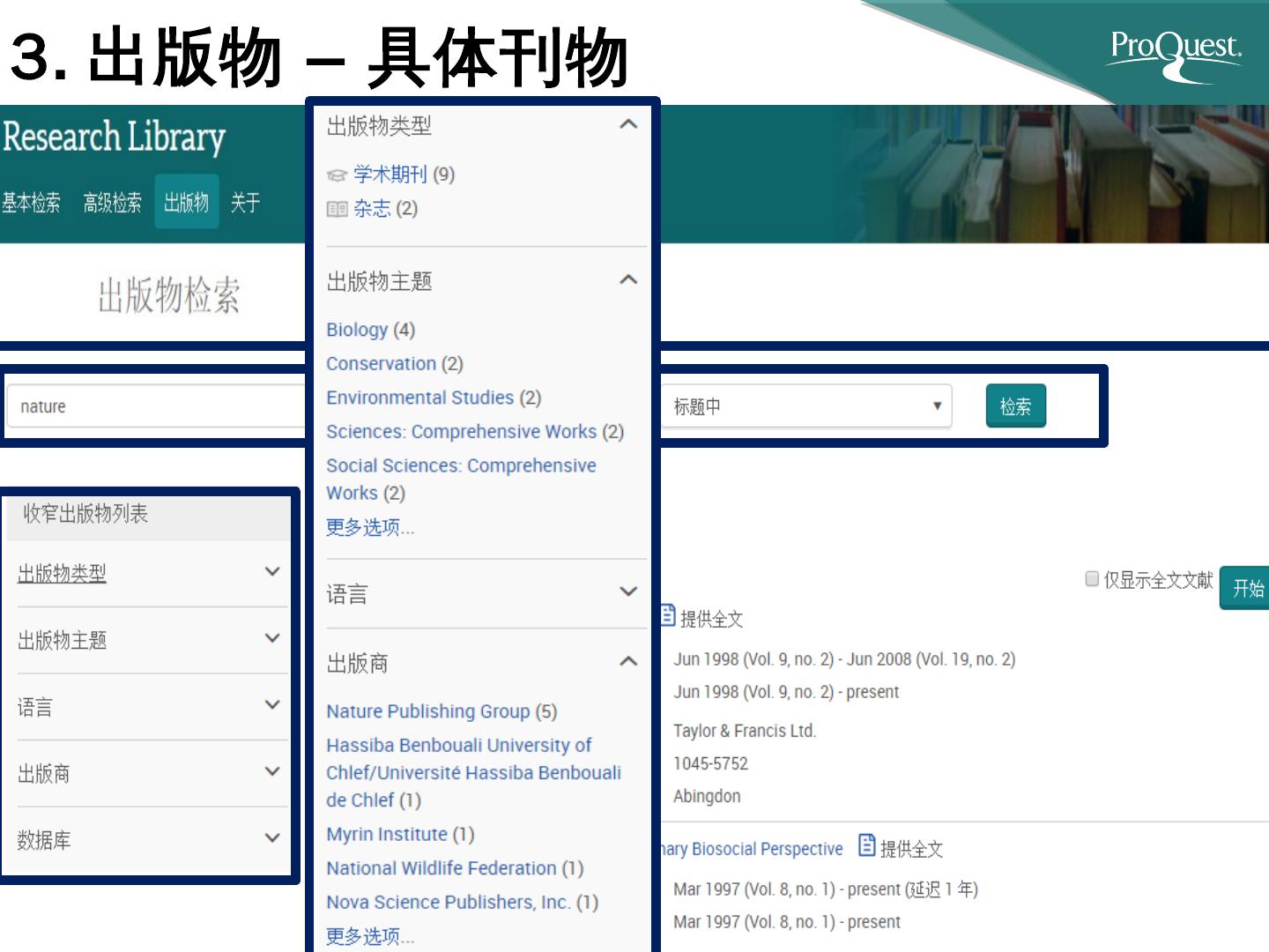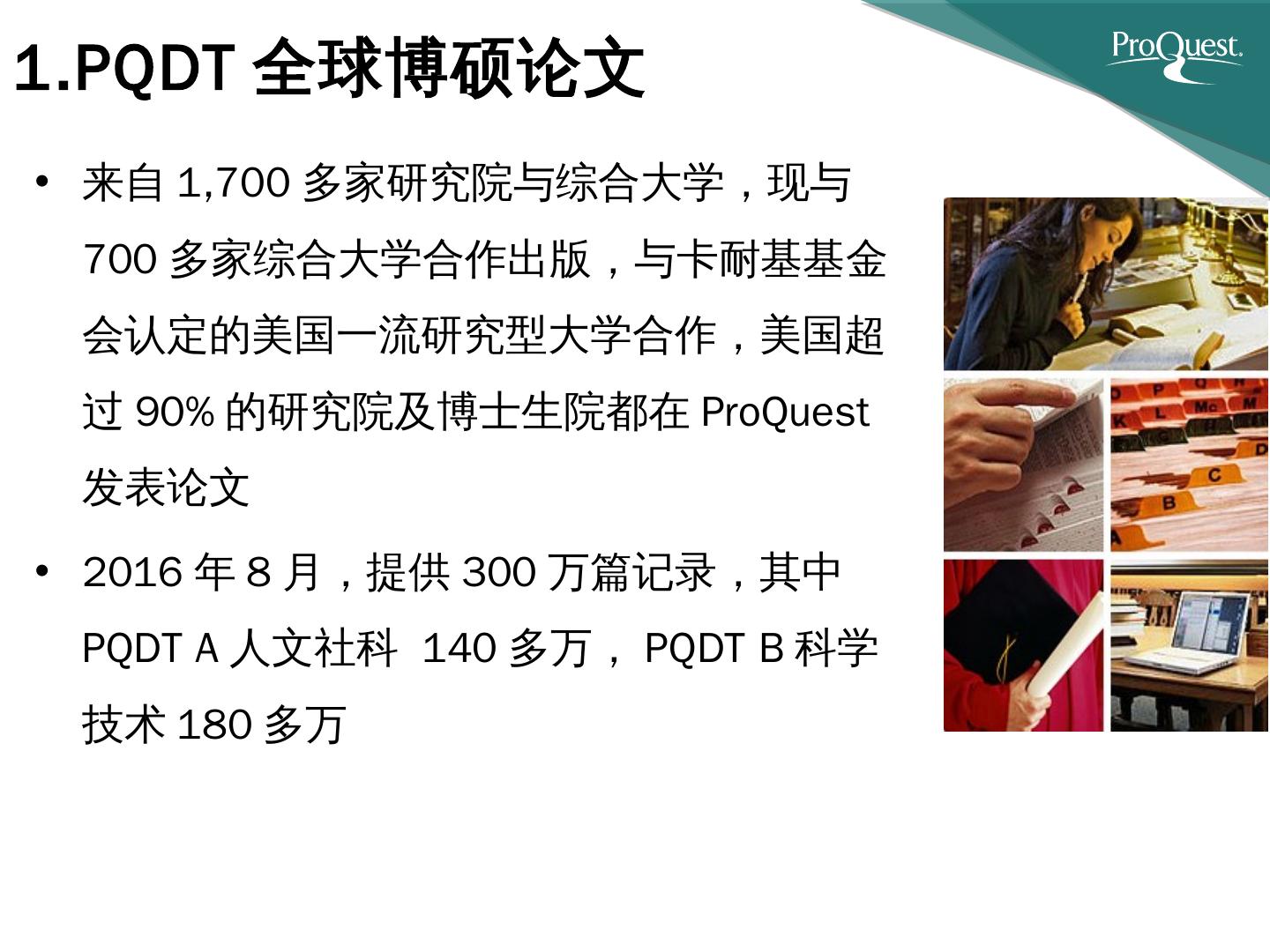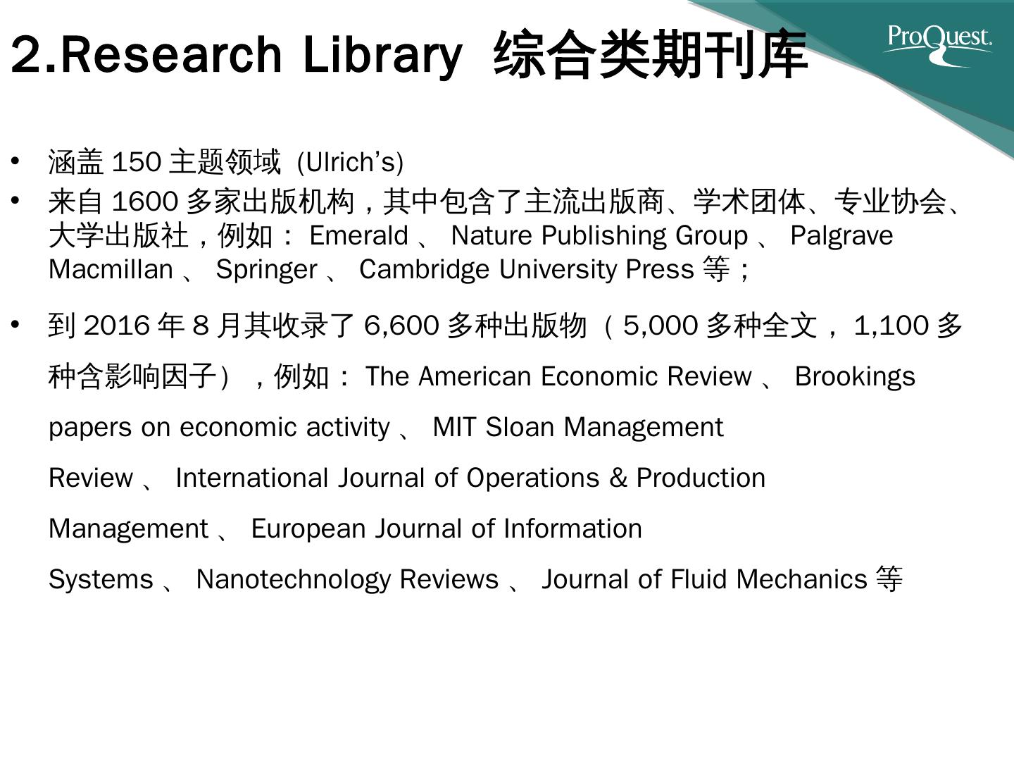 ... 及博士生院都在ProQuest发表论文; 2016年8月,提供300万篇记录,其中PQDT A人文社科140多万,PQDT B科学技术180多万. 2.Research Library 综合类期刊库.
