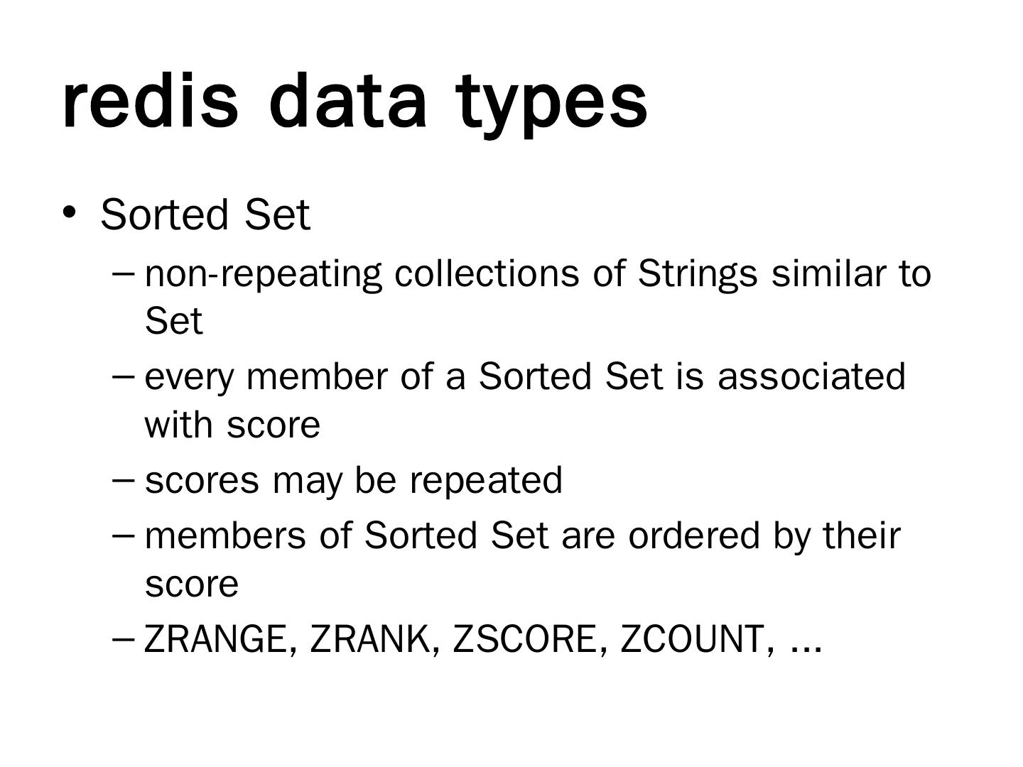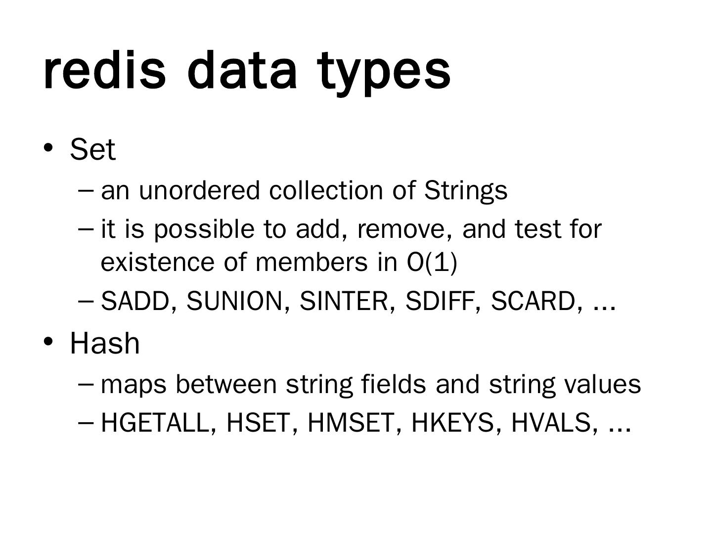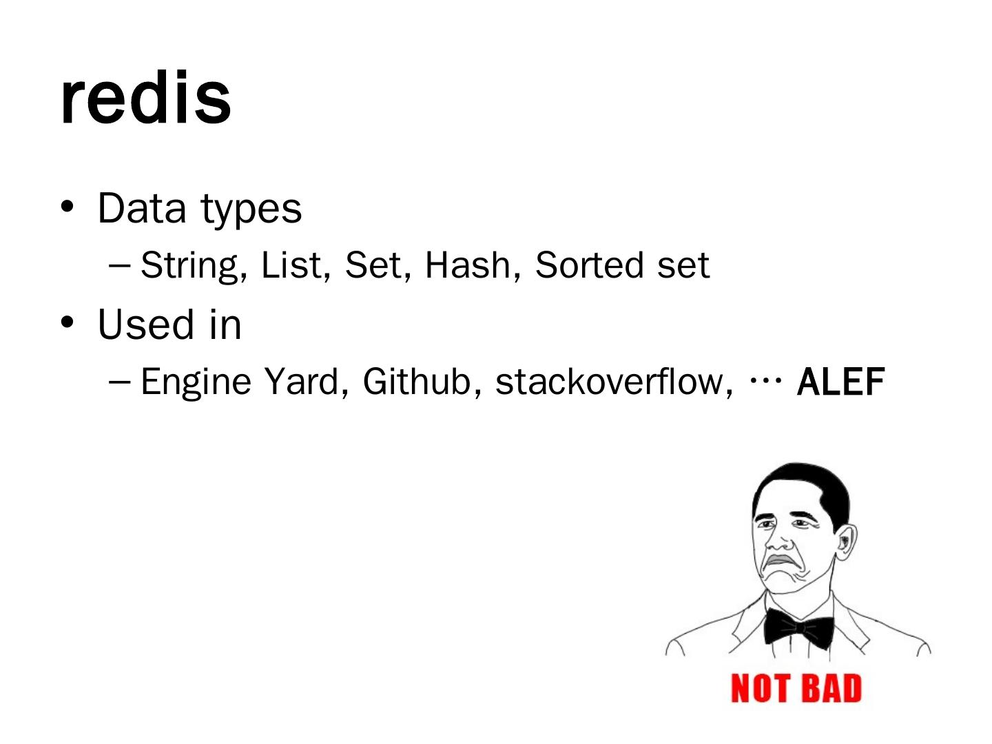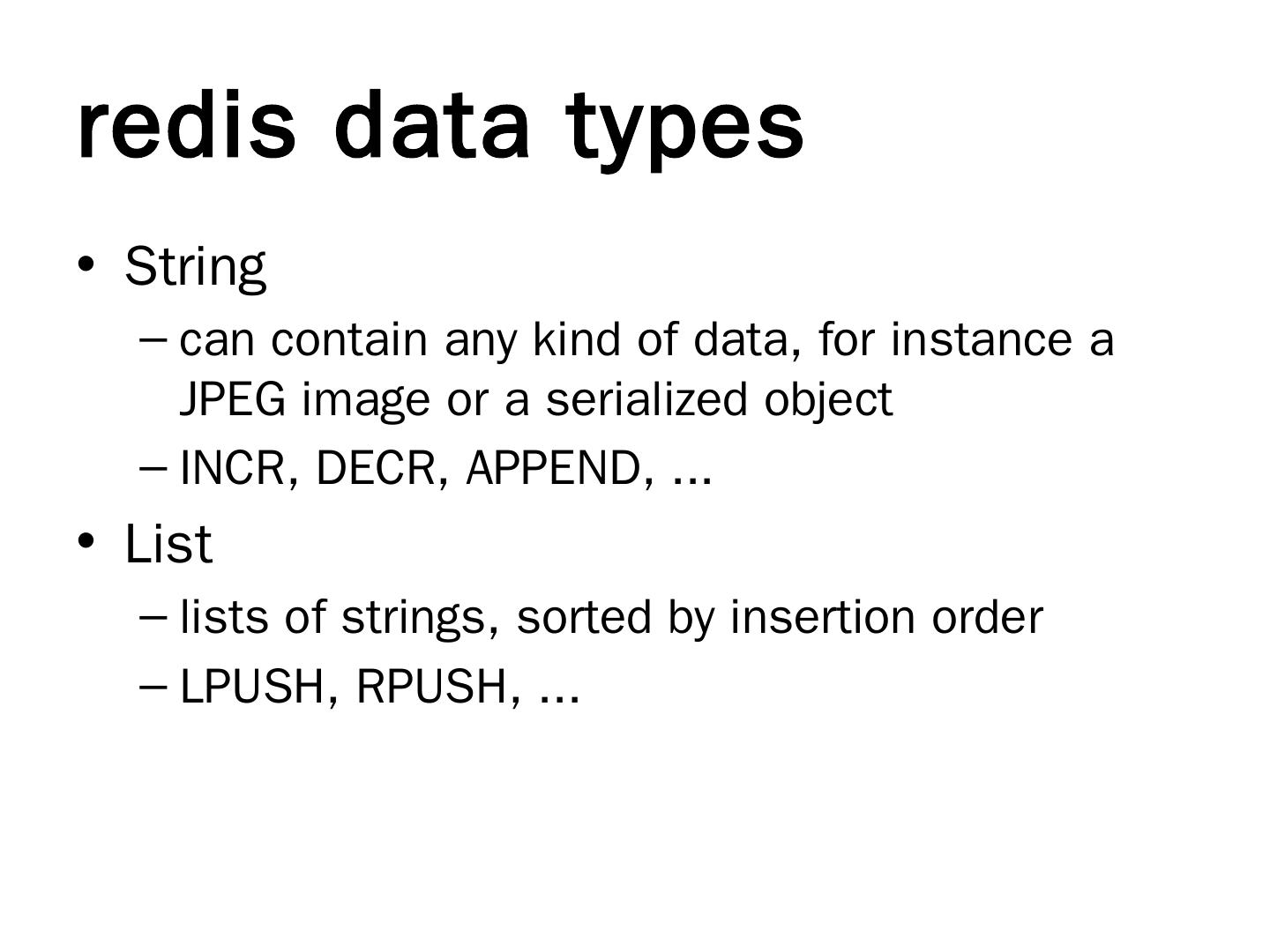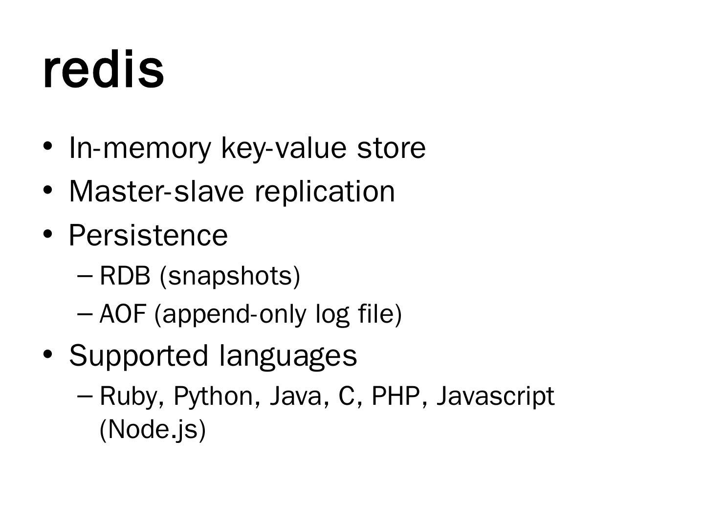 redis. In-memory key-value store; Master-slave replication; Persistence. RDB (snapshots); AOF (append-only log file). Supported languages. Ruby, Python, Java ...