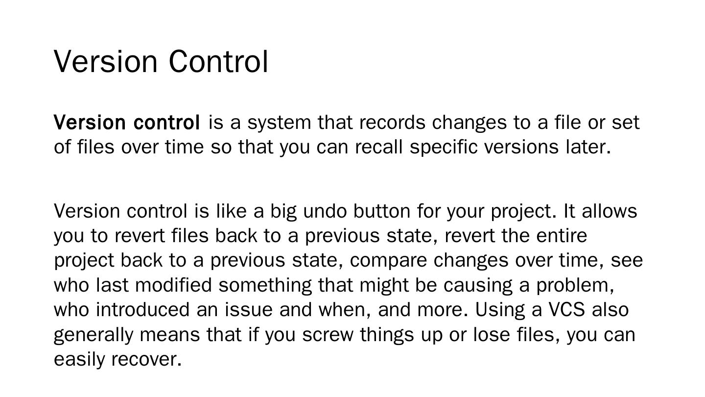 Version Control with git. Version Control. Version control is a system that records changes to a file or set of files over time so that you can recall specific versions ...