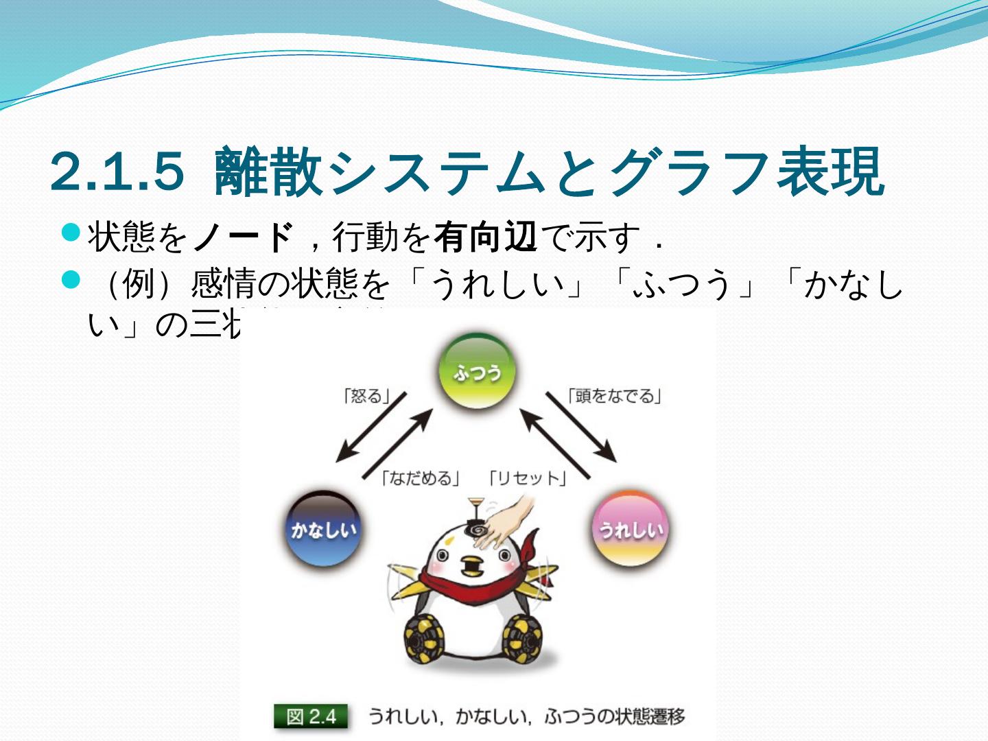 このような状況を数学的に表現することを目指す. ... 離散システム(discrete system) では,状態(state) も行動(action) も離散的な ... 2.1.5 離散システムとグラフ表現.
