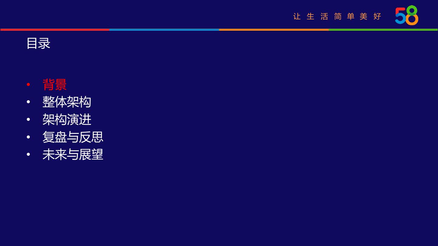 3 . 让 生 活 简 单 美 好 目录 • 背景 • 整体架构 • 架构演进 • 复盘与反思 • 未来与展望