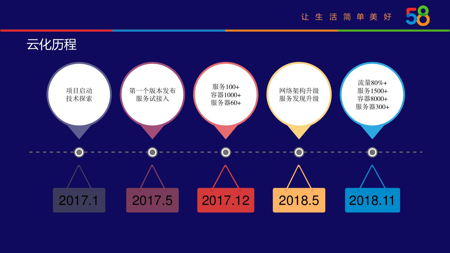 6 . 让 生 活 简 单 美 好 云化历程 流量80%+ 服务100+ 项目启动 第一个版本发布 网络架构升级 服务1500+ 容器1000+ 技术探索 服务试接入 服务发现升级 容器8000+ 服务器60+ 服务器300+ 2017.1 2017.5 2017.12 2018.5 2018.11