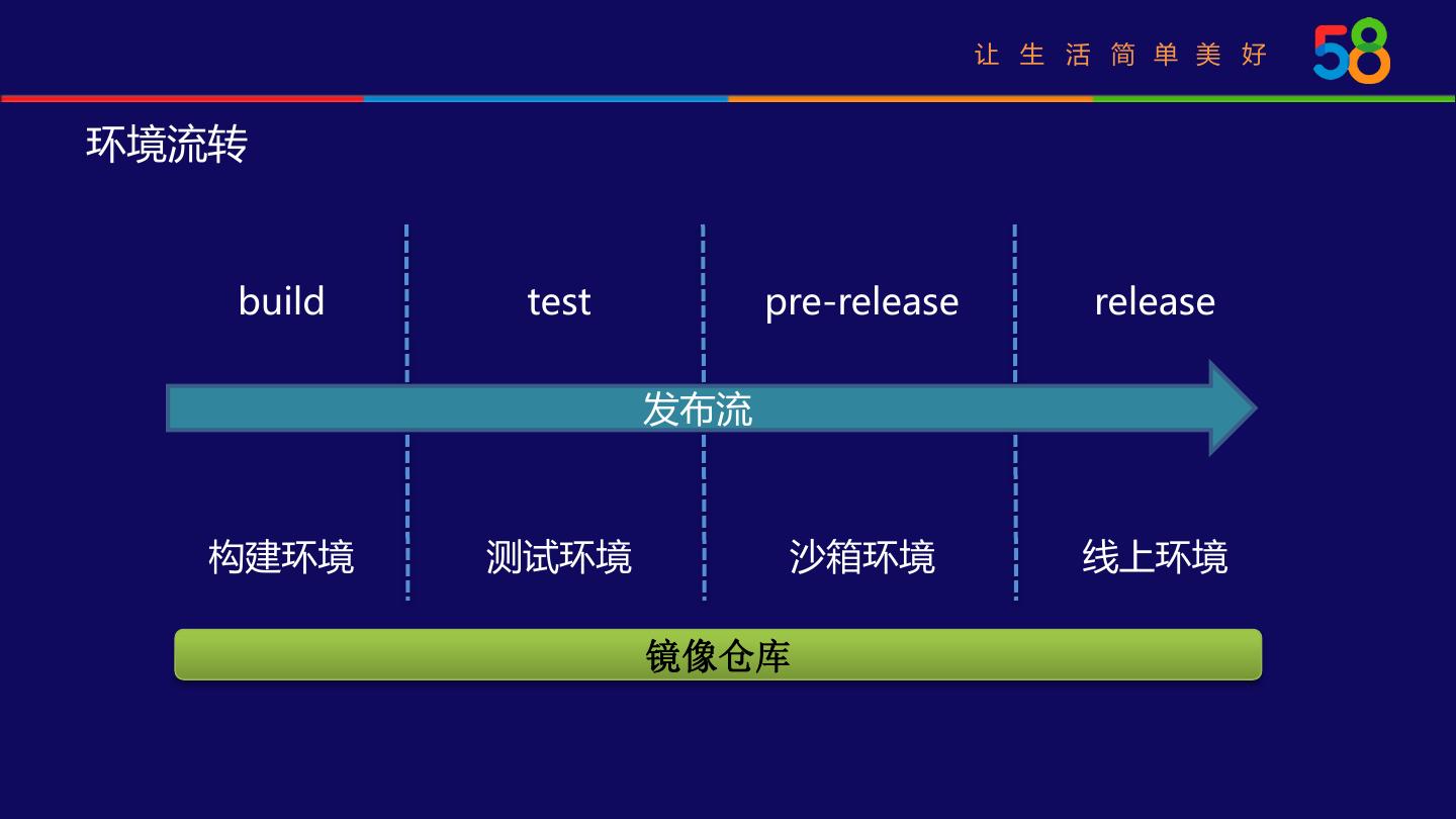 10 . 让 生 活 简 单 美 好 环境流转 build test pre-release release 发布流 构建环境 测试环境 沙箱环境 线上环境 镜像仓库