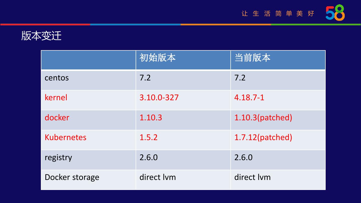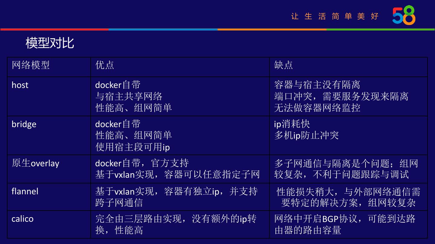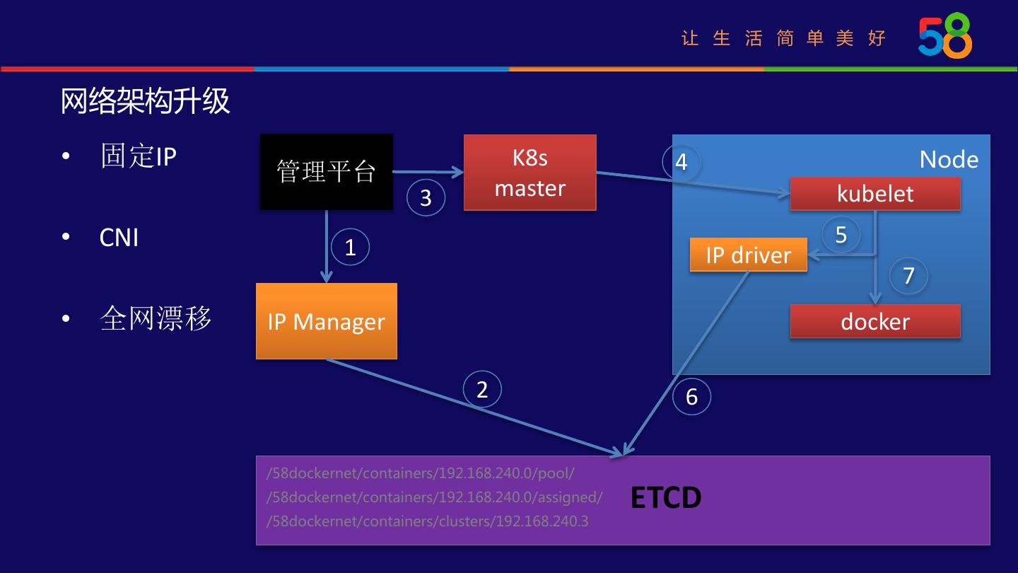 17 . 让 生 活 简 单 美 好 网络架构升级 • 固定IP K8s 4 Node 管理平台 3 master kubelet • CNI 1 5 IP driver 7 • 全网漂移 IP Manager docker 2 6 /58dockernet/containers/192.168.240.0/pool/ /58dockernet/containers/192.168.240.0/assigned/ ETCD /58dockernet/containers/clusters/192.168.240.3