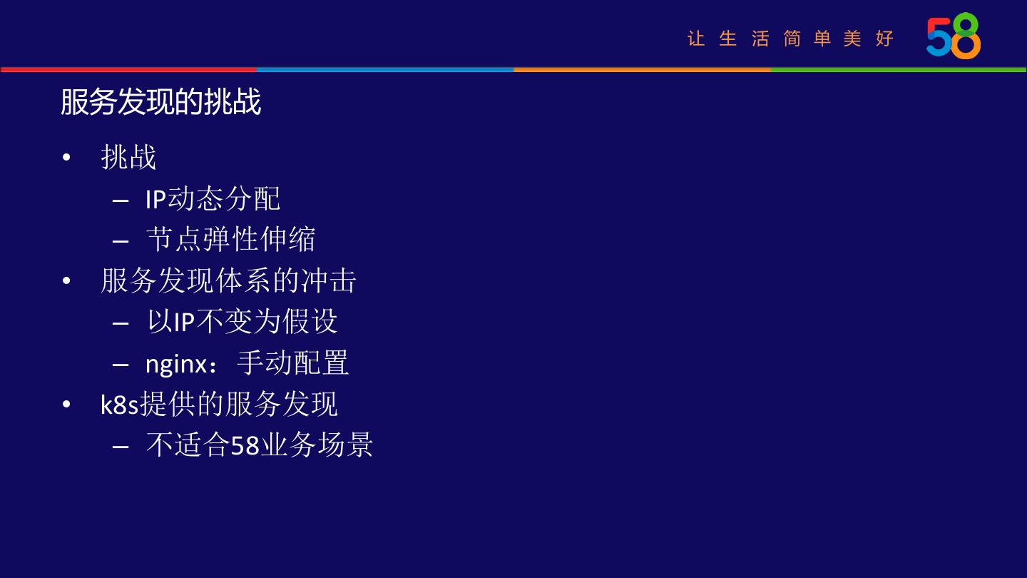 20 . 让 生 活 简 单 美 好 服务发现的挑战 • 挑战 – IP动态分配 – 节点弹性伸缩 • 服务发现体系的冲击 – 以IP不变为假设 – nginx:手动配置 • k8s提供的服务发现 – 不适合58业务场景