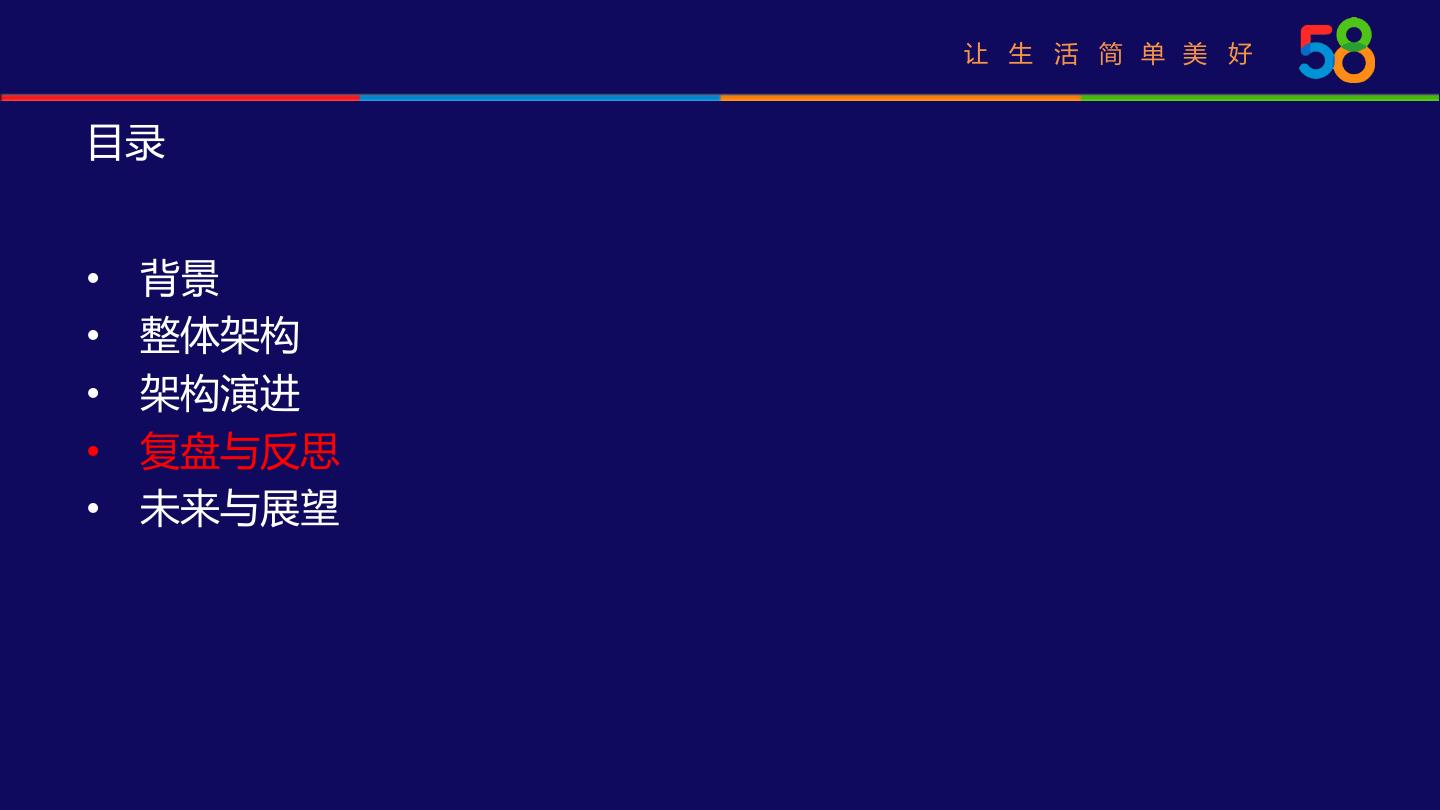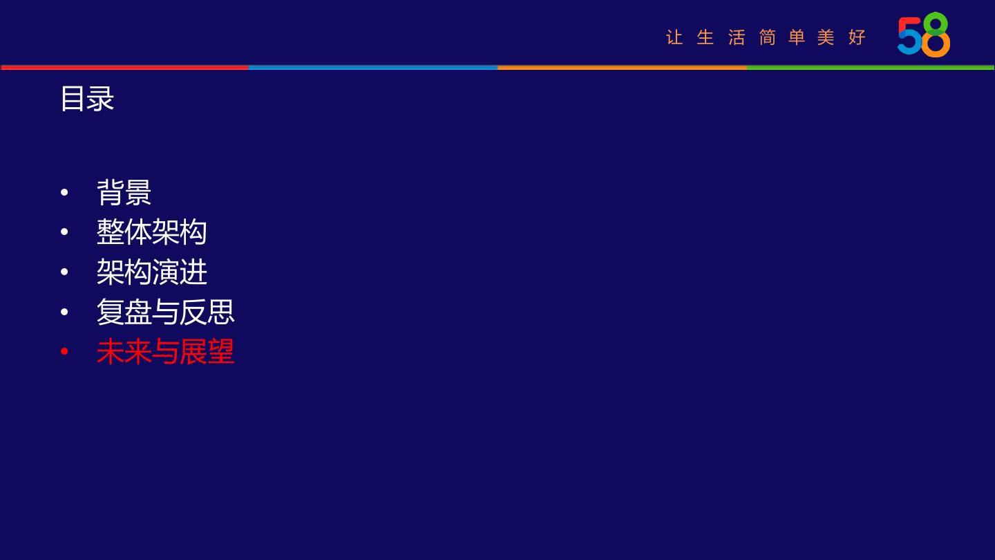 7 . 让 生 活 简 单 美 好 目录 • 背景 • 整体架构 • 架构演进 • 复盘与反思 • 未来与展望
