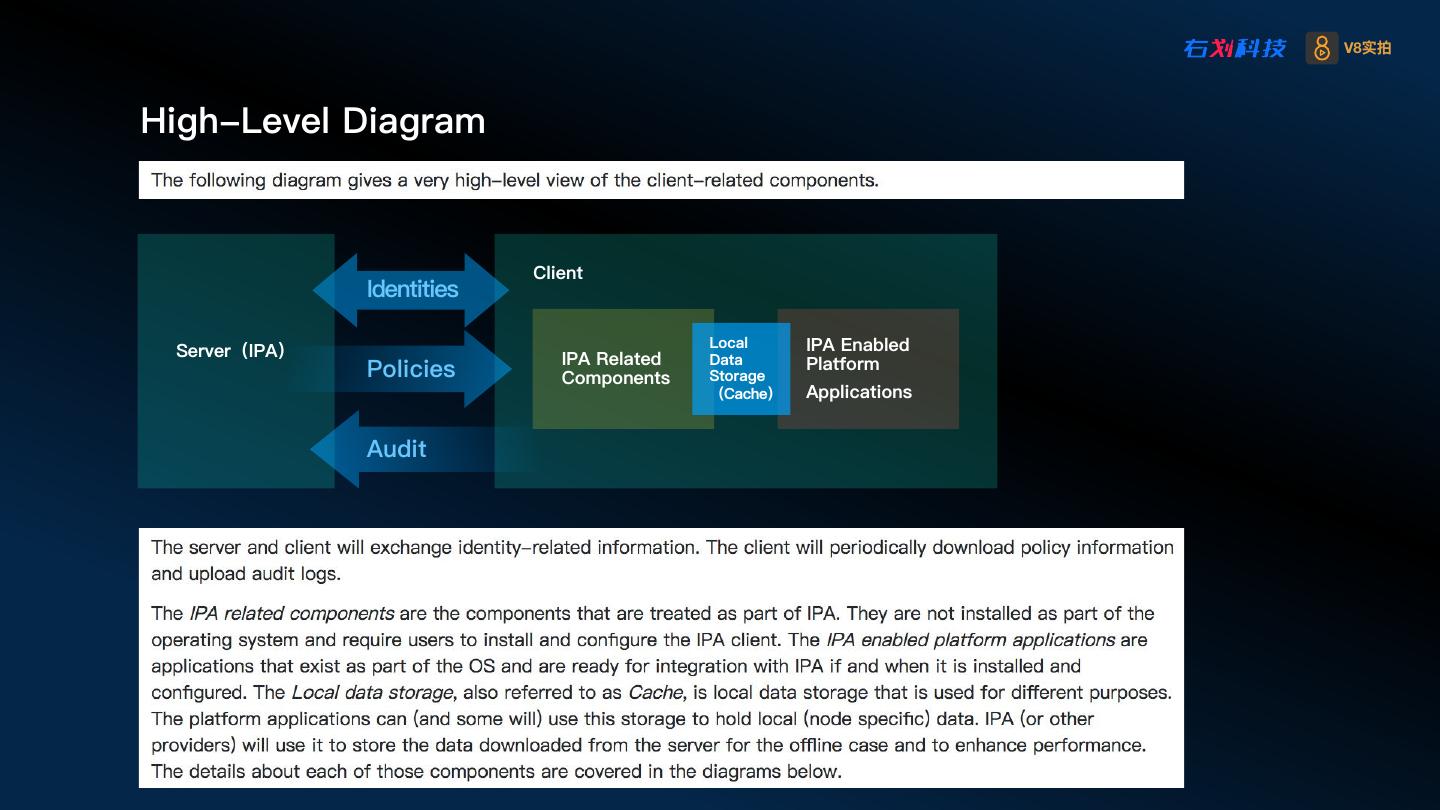 6 . V8实拍 High-Level Diagram Client Identities Server(IPA) Local IPA Enabled IPA Related Data Platform Policies Components Storage (Cache) Applications Audit