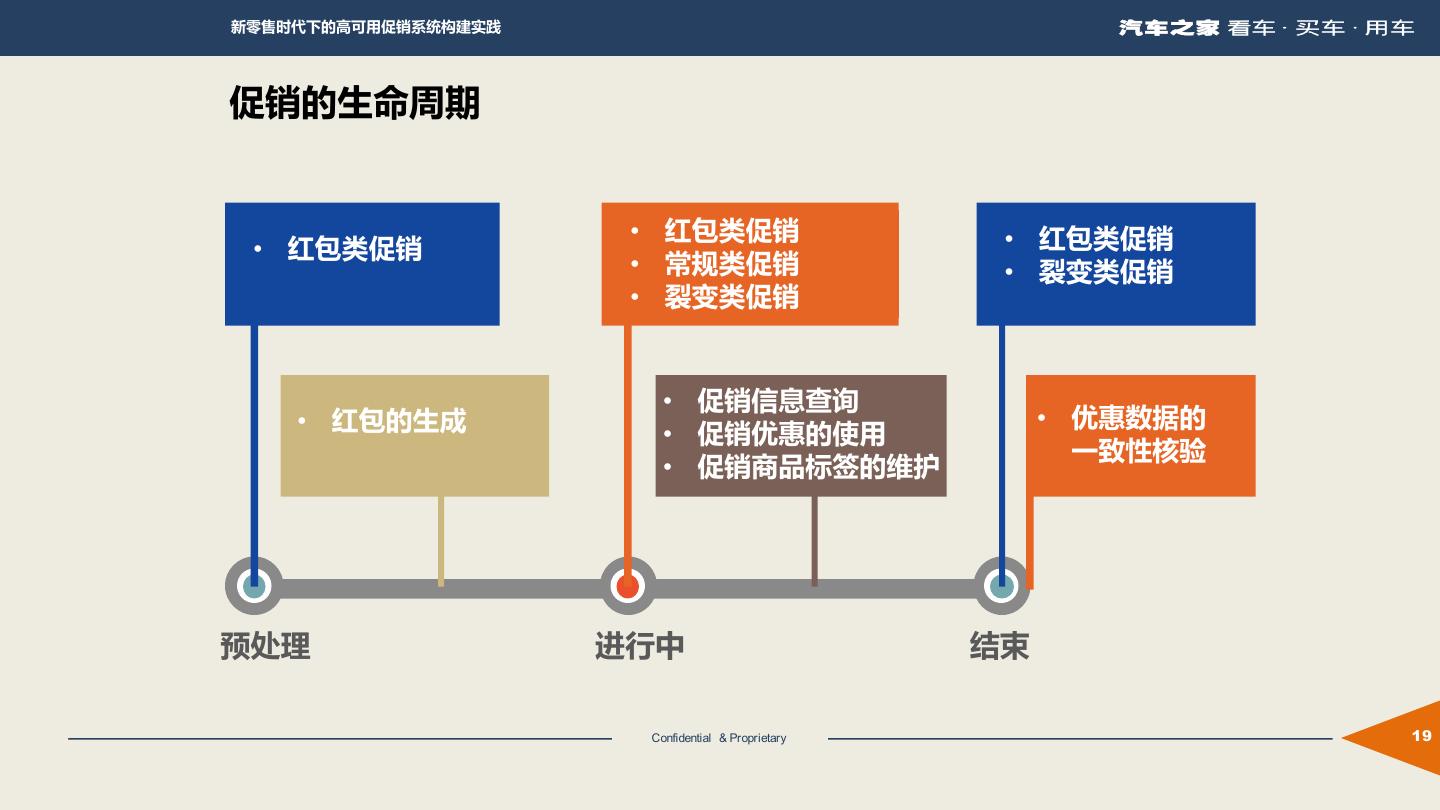 18 .新零售时代下的高可用促销系统构建实践 红包类促销的用户关系 红包领用关系 红包领用关系(续) 批次号 使用红包的订单号 展示 用户标识 外部订单号 券码 用券时间 领取时间 用券平台 绑定关系 领取统计签 用券节点 领取key 抵扣方式 使用开始/结束时间 红包类型 统计 金额 广告语 使用平台 状态 推广平台 使用节点 Confidential & Proprietary 18