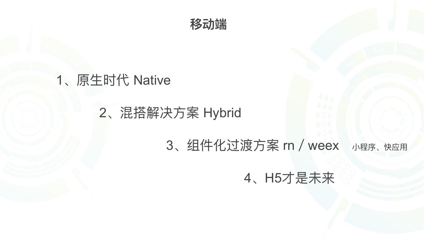 10 . 移动端 1、原⽣生时代 Native 2、混搭解决⽅方案 Hybrid 3、组件化过渡⽅方案 rn/weex ⼩小程序、快应⽤用 4、H5才是未来
