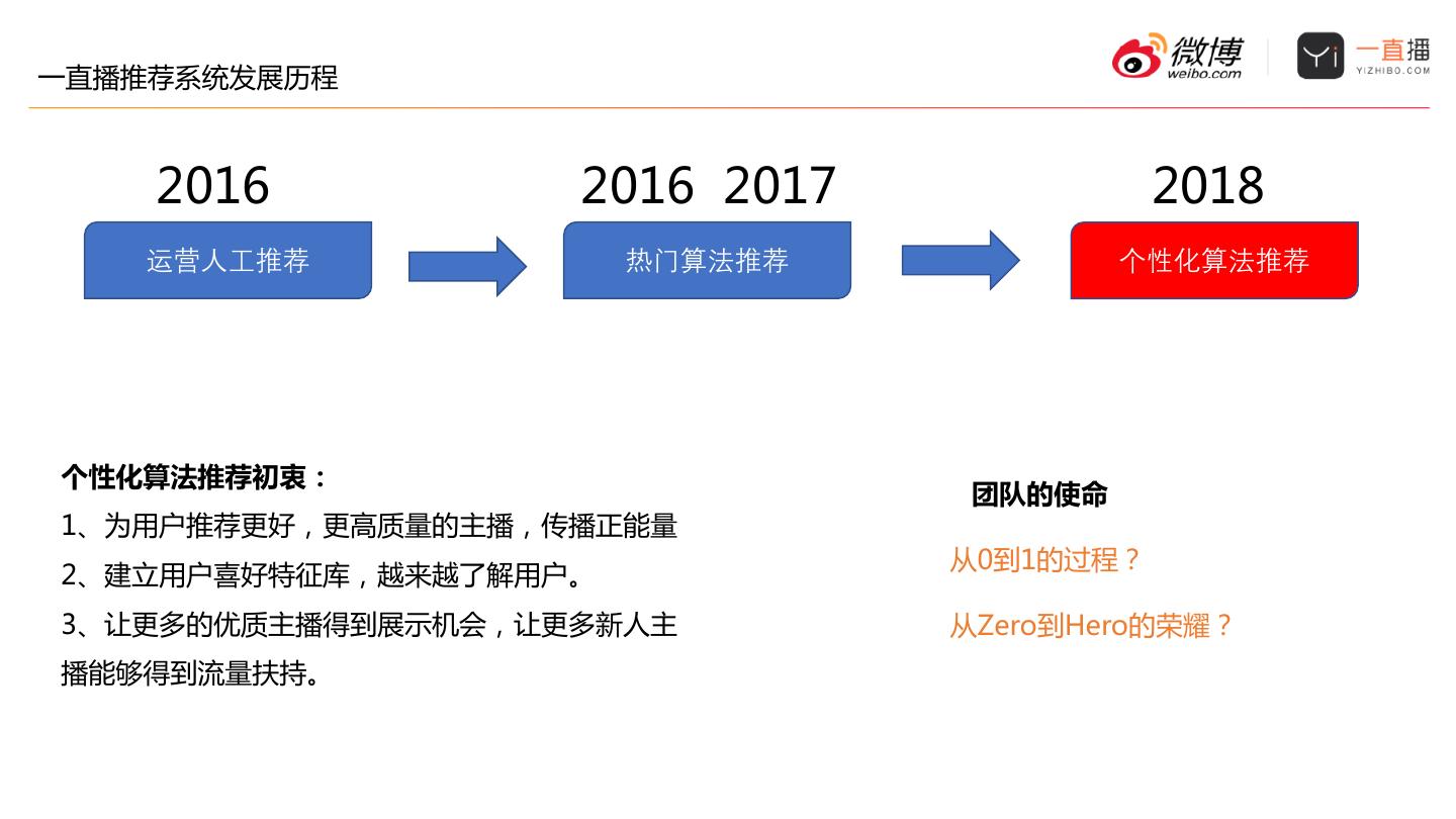 4 .一直播推荐系统发展历程 2016 2016 2017 2018 运营人工推荐 热门算法推荐 个性化算法推荐 个性化算法推荐初衷: 团队的使命 1、为用户推荐更好,更高质量的主播,传播正能量 从0到1的过程? 2、建立用户喜好特征库,越来越了解用户。 3、让更多的优质主播得到展示机会,让更多新人主 从Zero到Hero的荣耀? 播能够得到流量扶持。