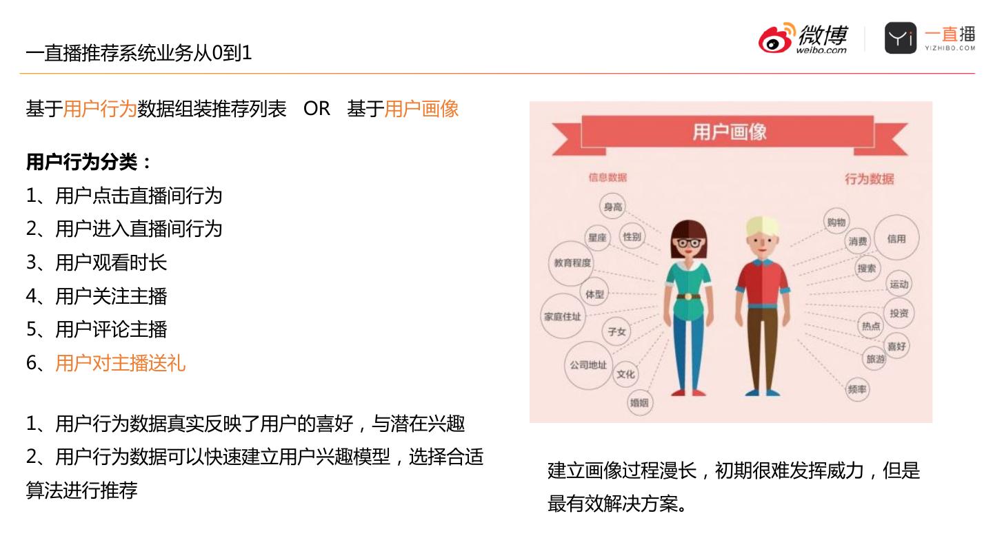 7 .一直播推荐系统业务从0到1 基于用户行为数据组装推荐列表 OR 基于用户画像 用户行为分类: 1、用户点击直播间行为 2、用户进入直播间行为 3、用户观看时长 4、用户关注主播 5、用户评论主播 6、用户对主播送礼 1、用户行为数据真实反映了用户的喜好,与潜在兴趣 2、用户行为数据可以快速建立用户兴趣模型,选择合适 建立画像过程漫长,初期很难发挥威力,但是 算法进行推荐 最有效解决方案。