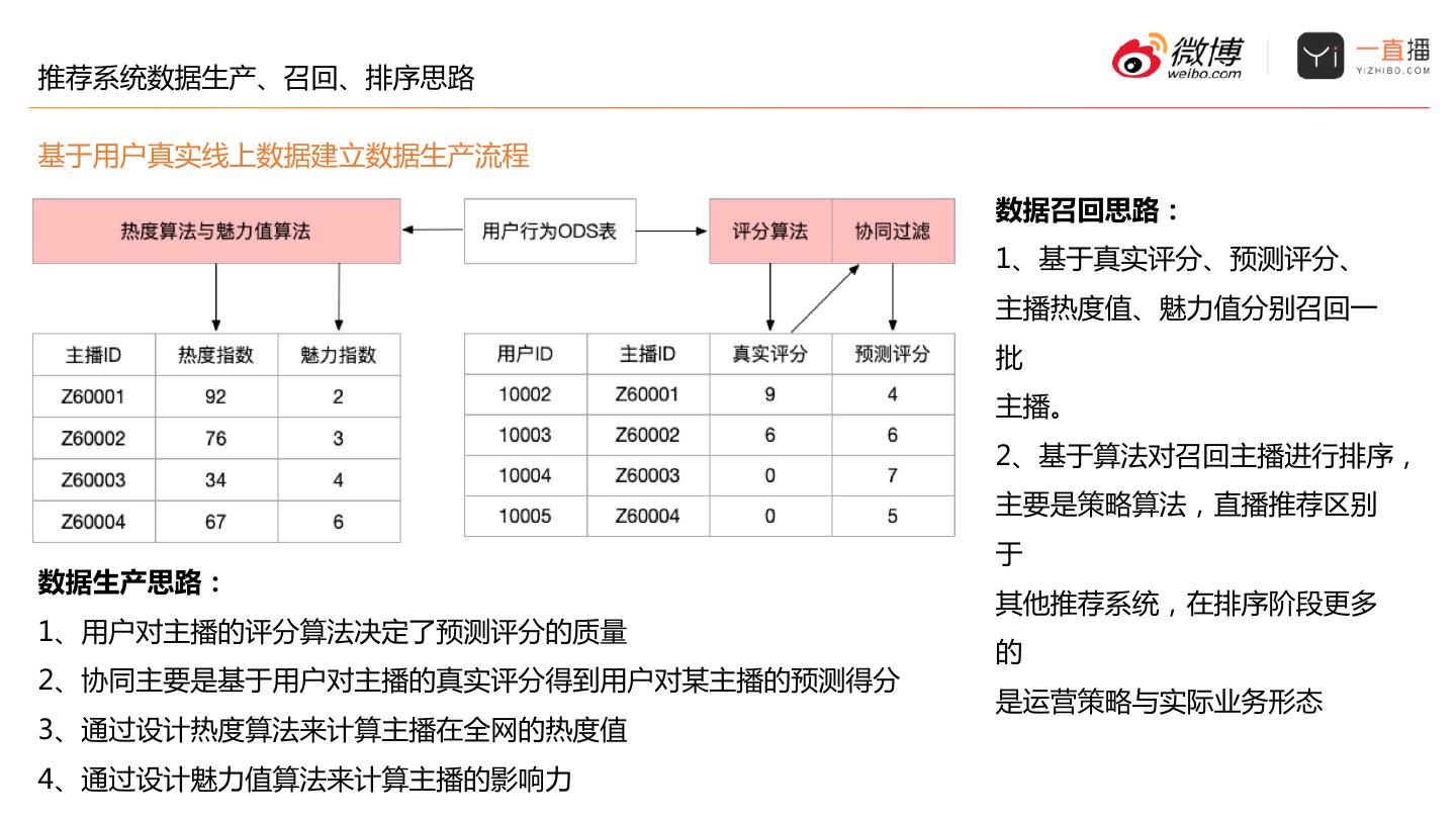 8 .推荐系统数据生产、召回、排序思路 基于用户真实线上数据建立数据生产流程 数据召回思路: 1、基于真实评分、预测评分、 主播热度值、魅力值分别召回一 批 主播。 2、基于算法对召回主播进行排序, 主要是策略算法,直播推荐区别 于 数据生产思路: 其他推荐系统,在排序阶段更多 1、用户对主播的评分算法决定了预测评分的质量 的 2、协同主要是基于用户对主播的真实评分得到用户对某主播的预测得分 是运营策略与实际业务形态 3、通过设计热度算法来计算主播在全网的热度值 4、通过设计魅力值算法来计算主播的影响力