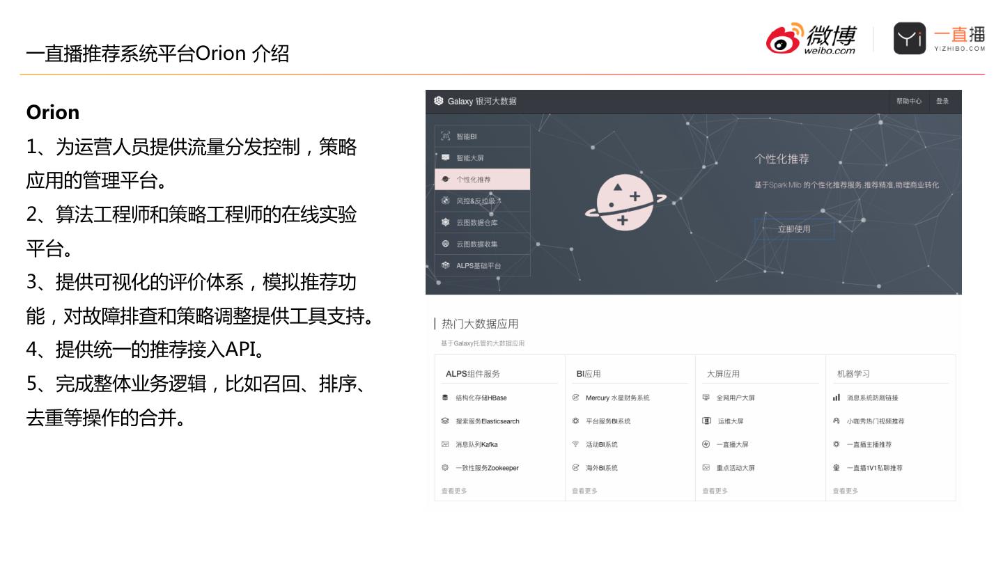 10 .一直播推荐系统平台Orion 介绍 Orion 1、为运营人员提供流量分发控制,策略 应用的管理平台。 2、算法工程师和策略工程师的在线实验 平台。 3、提供可视化的评价体系,模拟推荐功 能,对故障排查和策略调整提供工具支持。 4、提供统一的推荐接入API。 5、完成整体业务逻辑,比如召回、排序、 去重等操作的合并。