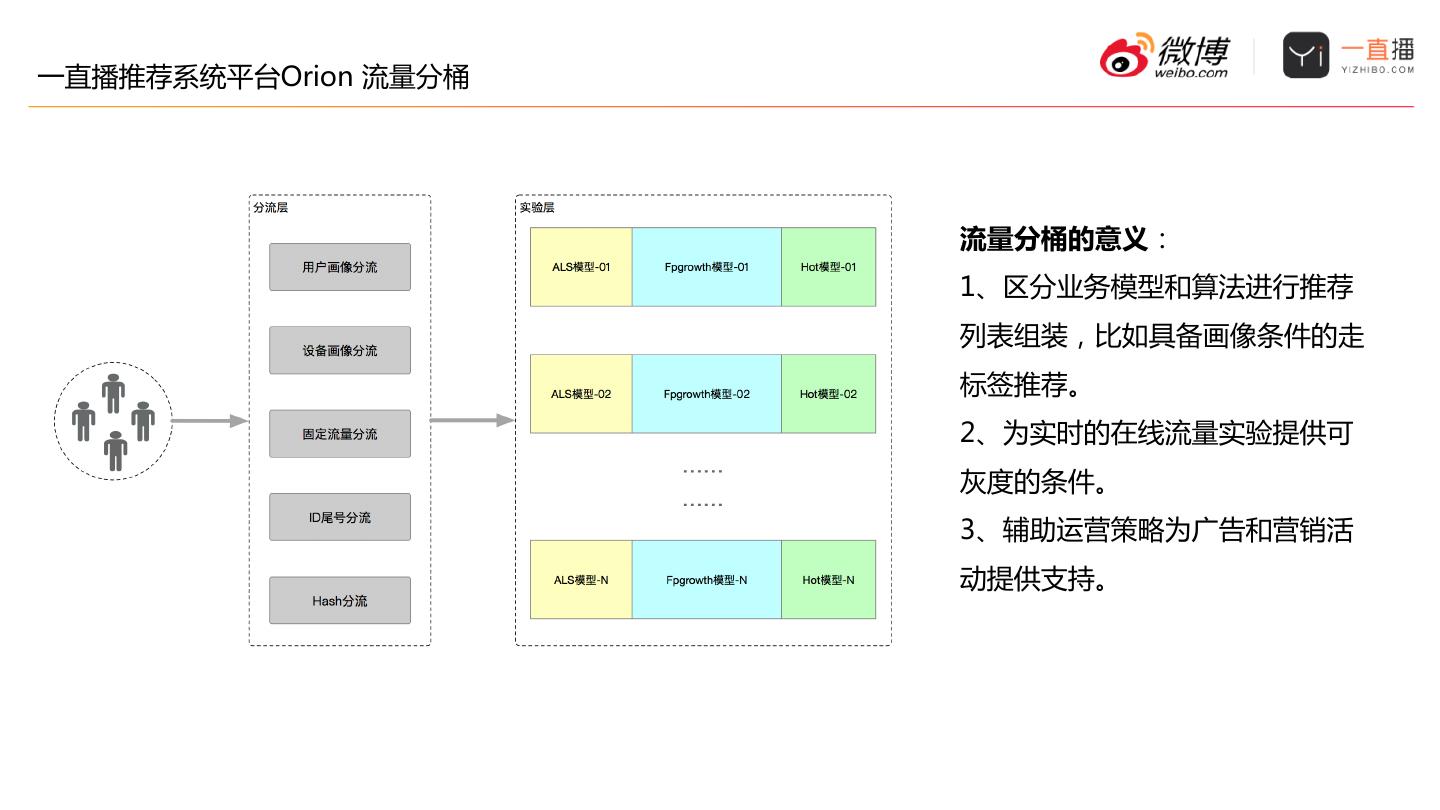 11 .一直播推荐系统平台Orion 流量分桶 流量分桶的意义: 1、区分业务模型和算法进行推荐 列表组装,比如具备画像条件的走 标签推荐。 2、为实时的在线流量实验提供可 灰度的条件。 3、辅助运营策略为广告和营销活 动提供支持。