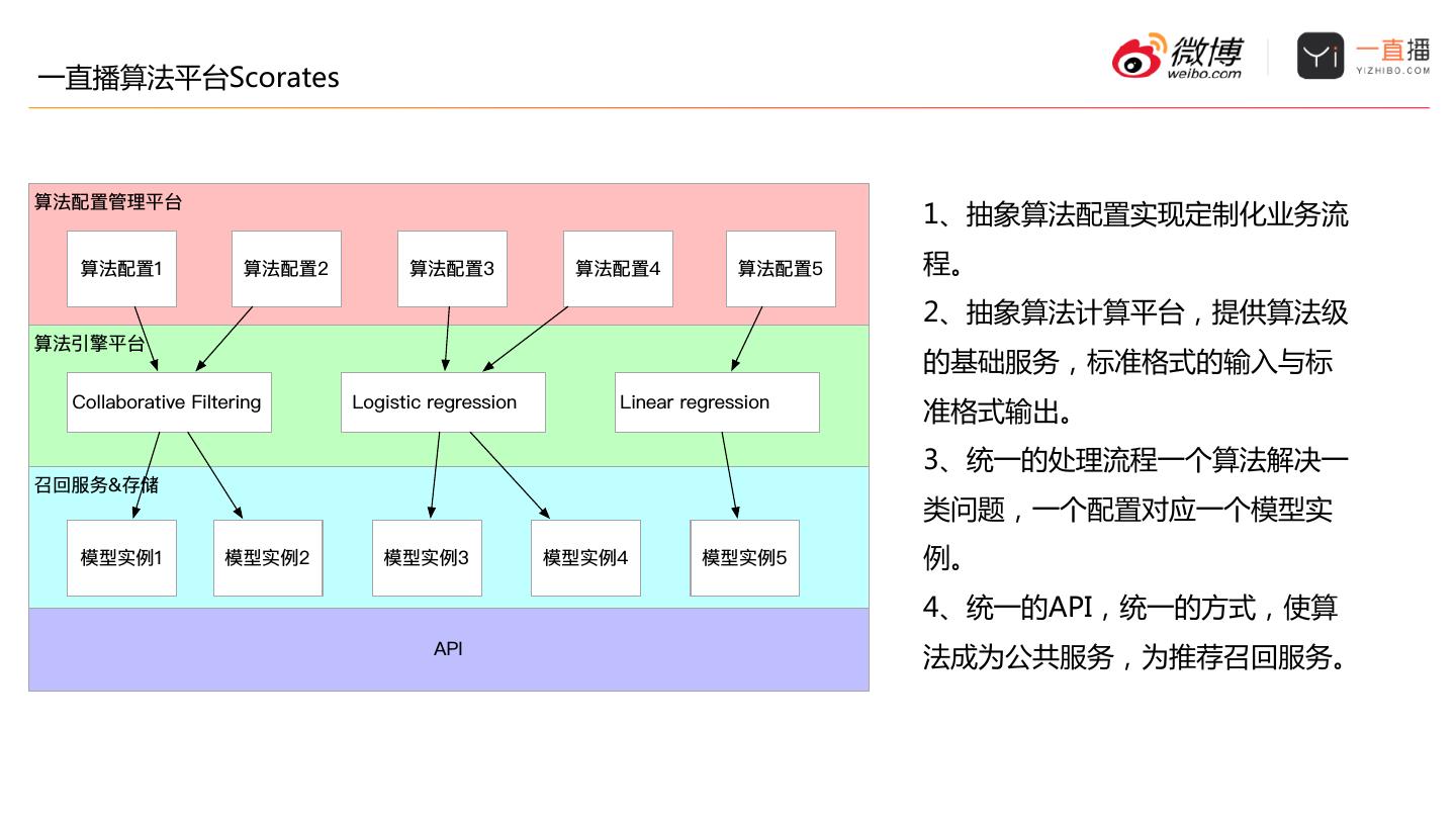 14 .一直播算法平台Scorates 1、抽象算法配置实现定制化业务流 程。 2、抽象算法计算平台,提供算法级 的基础服务,标准格式的输入与标 准格式输出。 3、统一的处理流程一个算法解决一 类问题,一个配置对应一个模型实 例。 4、统一的API,统一的方式,使算 法成为公共服务,为推荐召回服务。