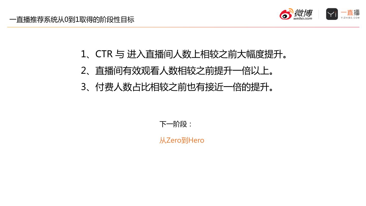16 .一直播推荐系统从0到1取得的阶段性目标 1、CTR 与 进入直播间人数上相较之前大幅度提升。 2、直播间有效观看人数相较之前提升一倍以上。 3、付费人数占比相较之前也有接近一倍的提升。 下一阶段: 从Zero到Hero