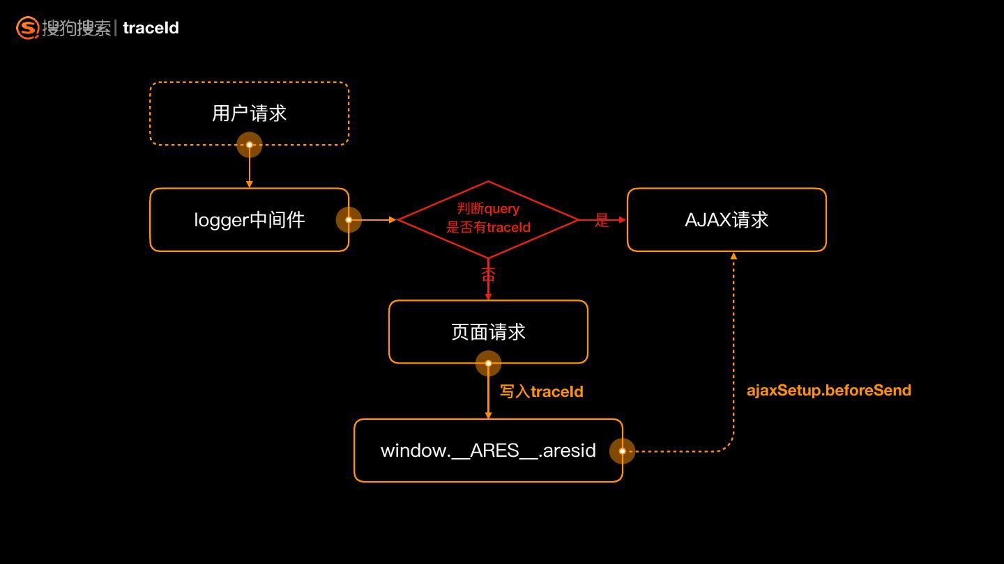11 .traceId ⽤用户请求 判断query logger中间件 是否有traceId 是 AJAX请求 否 ⻚页⾯面请求 写⼊入traceId ajaxSetup.beforeSend window.__ARES__.aresid