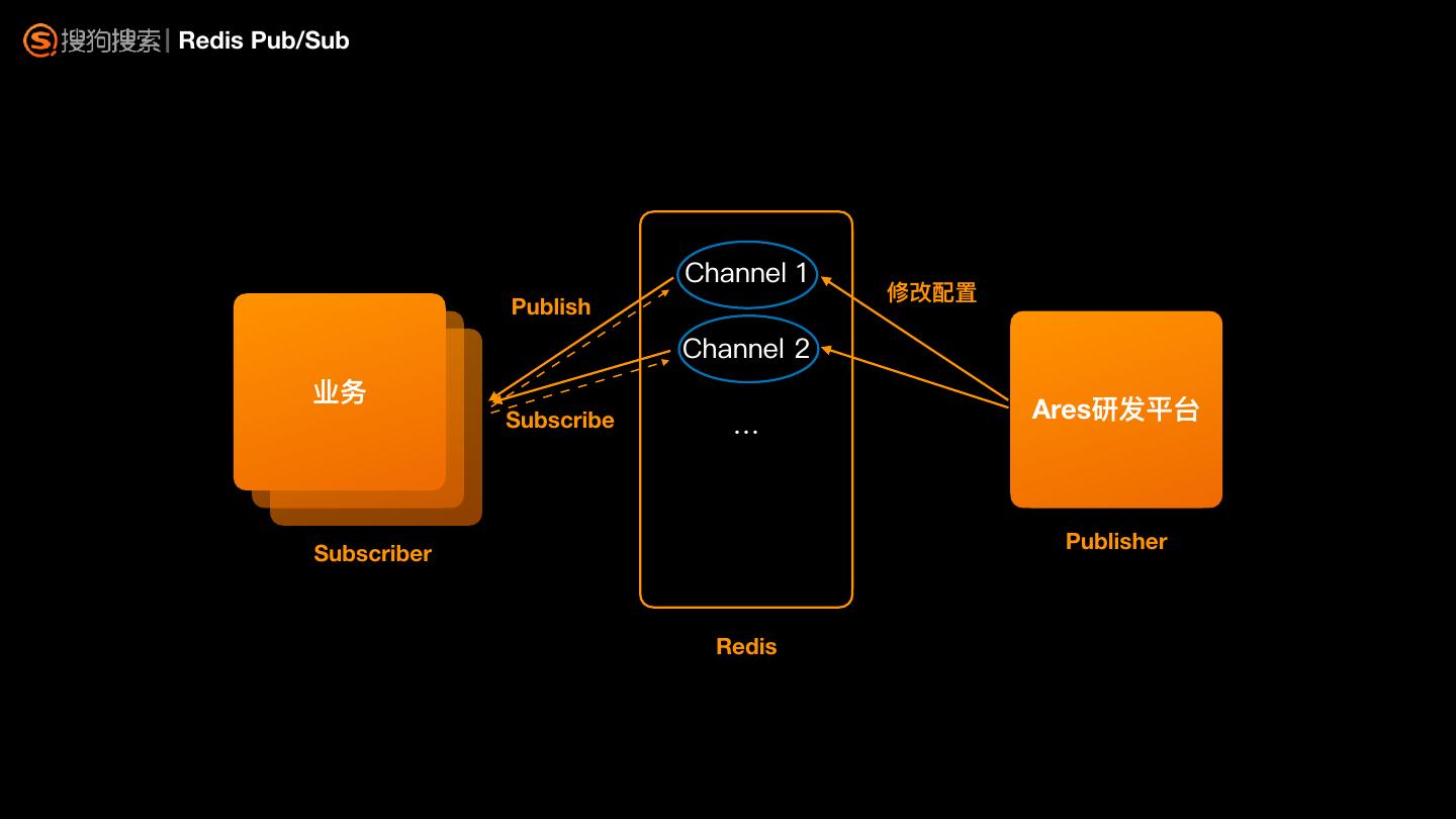 13 .Redis Pub/Sub Channel 1 修改配置 Publish Channel 2 业务 Subscribe Ares研发平台 … Publisher Subscriber Redis