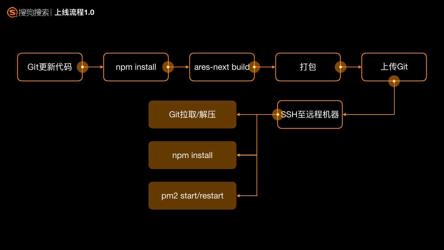 18 . 上线流程1.0 Git更更新代码 npm install ares-next build 打包 上传Git Git拉取/解压 SSH⾄至远程机器器 npm install pm2 start/restart