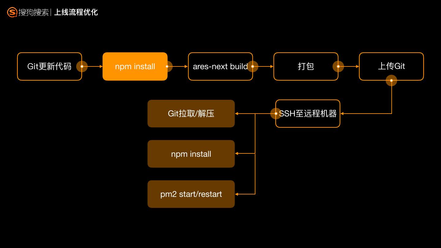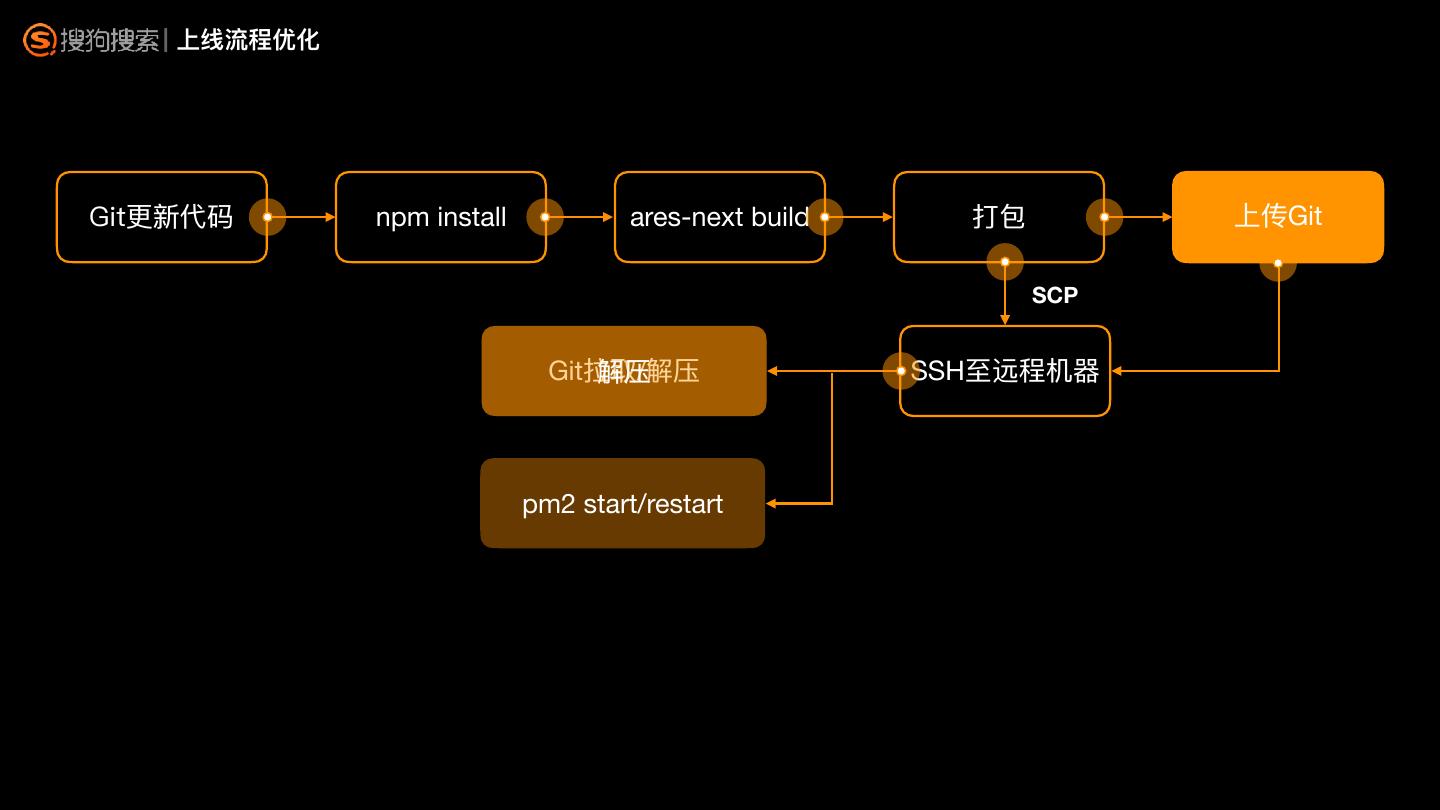 19 . 上线流程优化 Git更更新代码 npm install ares-next build 打包 上传Git Git拉取/解压 SSH⾄至远程机器器 npm install pm2 start/restart