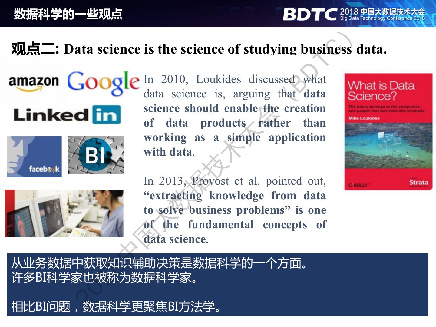 14 .数据科学的一些观点 ) 观点二: Data science is the science of studying business data. TC BD In 2010, Loukides discussed what data science is, arguing that data ( science should enable the creation 会 of data products rather than working as a simple application 大 with data. 术 技 In 2013, Provost et al. pointed out, 据 “extracting knowledge from data 数 to solve business problems” is one 大 of the fundamental concepts of data science. 国 中 从业务数据中获取知识辅助决策是数据科学的一个方面。 18 许多BI科学家也被称为数据科学家。 20 相比BI问题,数据科学更聚焦BI方法学。