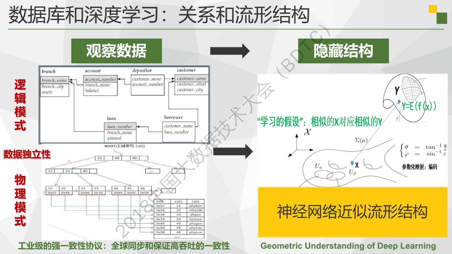 8 .数据库和深度学习:关系和流形结构 ) TC 观察数据 隐藏结构 BD ( 会 大 术 技 据 数 大 国 中 神经网络近似流形结构 18 20 工业级的强一致性协议:全球同步和保证高吞吐的一致性 Geometric Understanding of Deep Learning