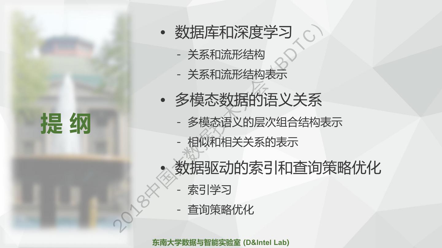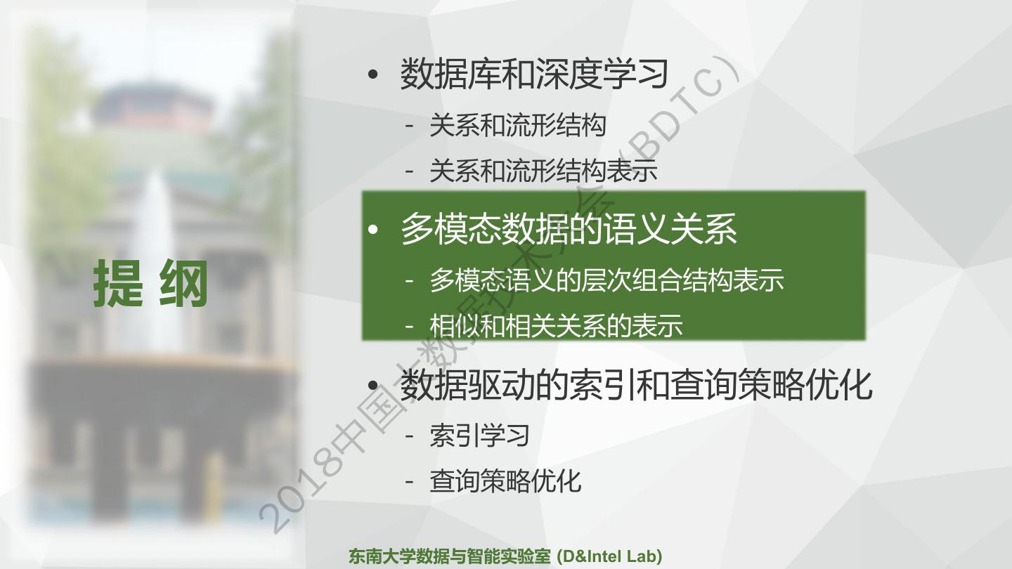 2 . · 数据库和深度学习 ) TC - 关系和流形结构 BD - 关系和流形结构表示 ( 会 · 多模态数据的语义关系 大 提纲 术 - 多模态语义的层次组合结构表示 技 - 相似和相关关系的表示 据 数 大 · 数据驱动的索引和查询策略优化 国 - 索引学习 中 18 - 查询策略优化 20 东南大学数据与智能实验室 (D&Intel Lab)