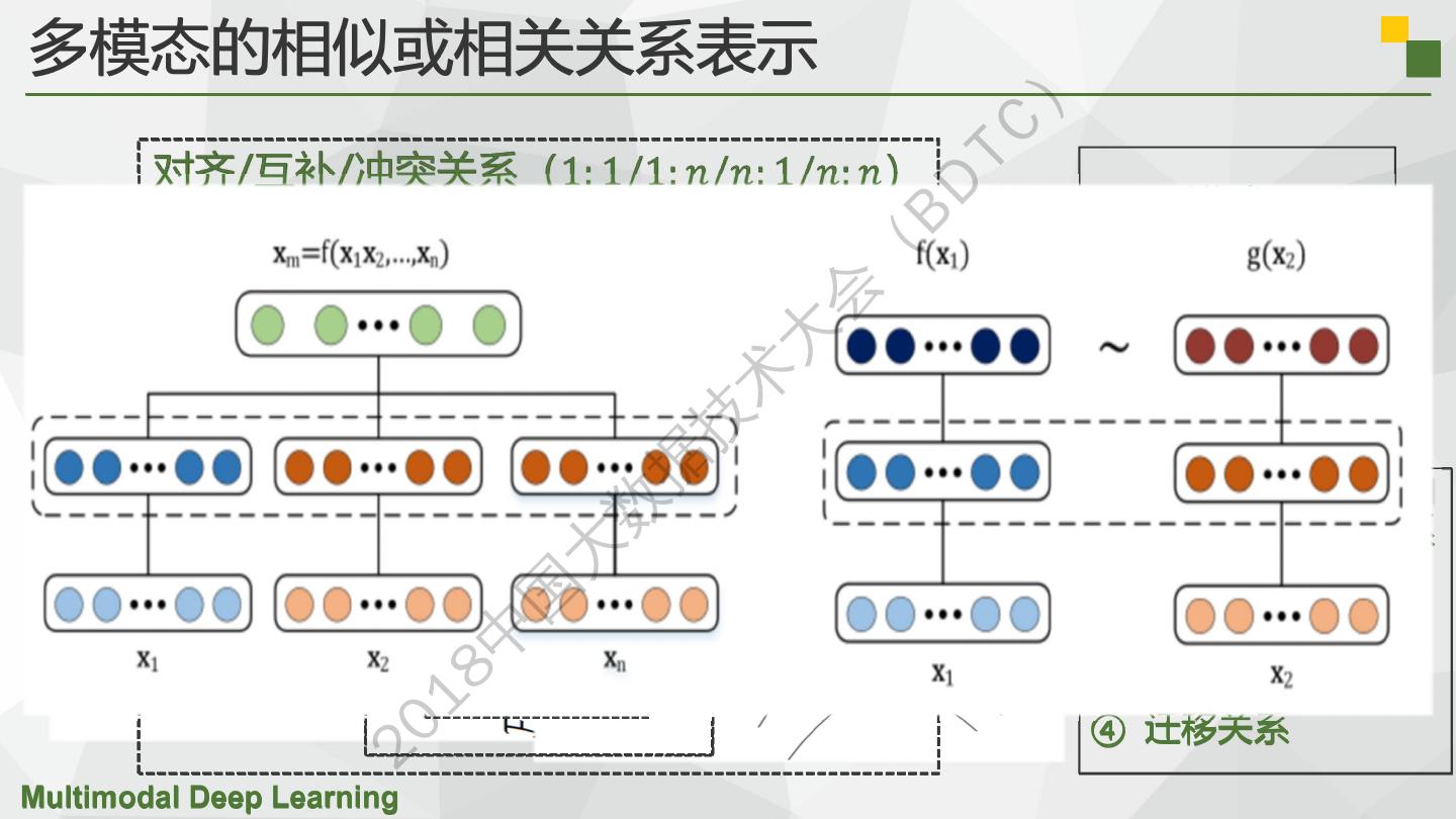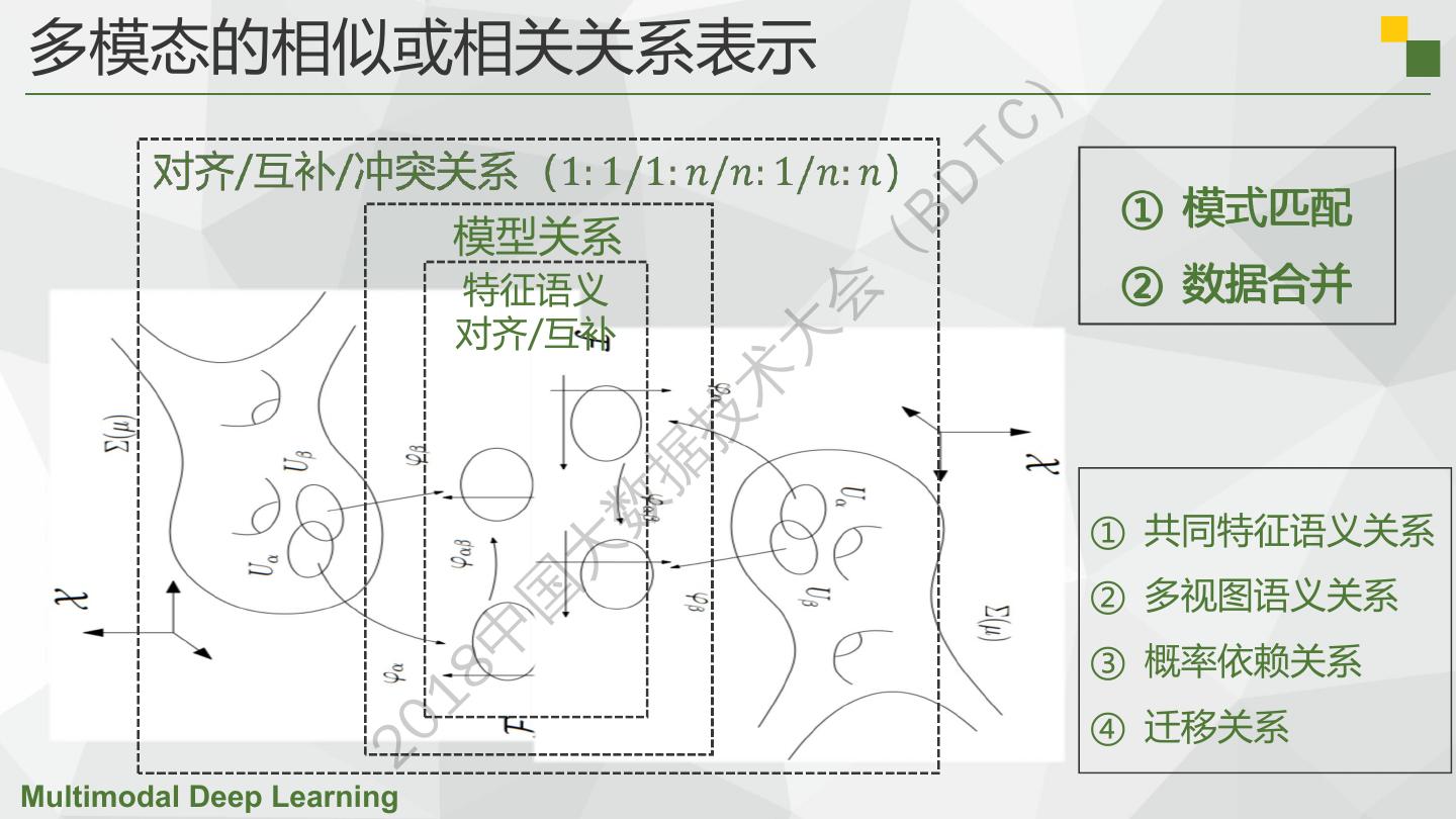 13 .多模态的相似或相关关系表示 ) TC BD ① 模式匹配 模型关系 ( 特征语义 ② 数据合并 会 对齐/互补 大 术 技 据 数 ① 共同特征语义关系 大 ② 多视图语义关系 国 中 ③ 概率依赖关系 18 ④ 迁移关系 20 Multimodal Deep Learning