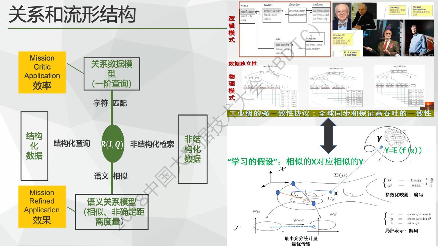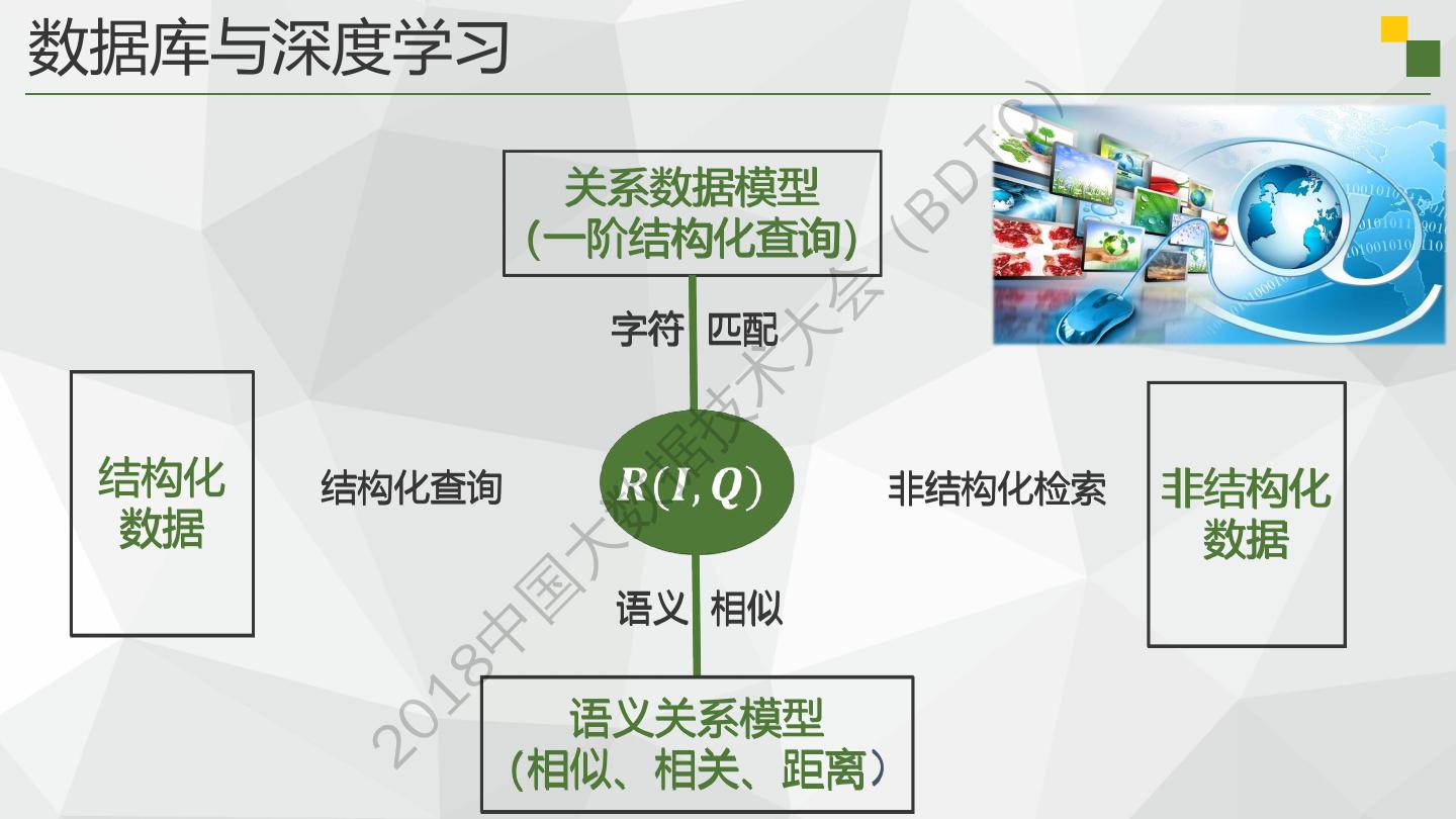 16 .数据库与深度学习 ) TC Mission Critic 关系数据模型 BD Application 效率 (一阶查询) ( 会 字符 匹配 大 术 技 结构化 非结构化 据 结构化查询 非结构化检索 数据 数 数据 大 国 语义 相似 中 Mission Refined 18 Application 语义关系模型 20 效果 (相似、非确定距离度量)