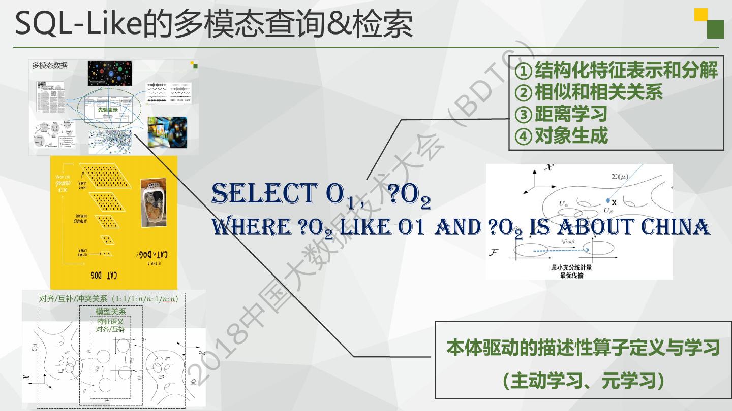 23 .SQL-Like的多模态查询&检索 ) ① 结构化特征表示和分解 TC ② 相似和相关关系 BD ③ 距离学习 ( ④ 对象生成 会 大 Select O1,?O2 术 技 Where ?O2 like O1 and ?O2 iS abOut china 据 数 大 国 中 本体驱动的描述性算子定义与学习 18 20 (主动学习、元学习)