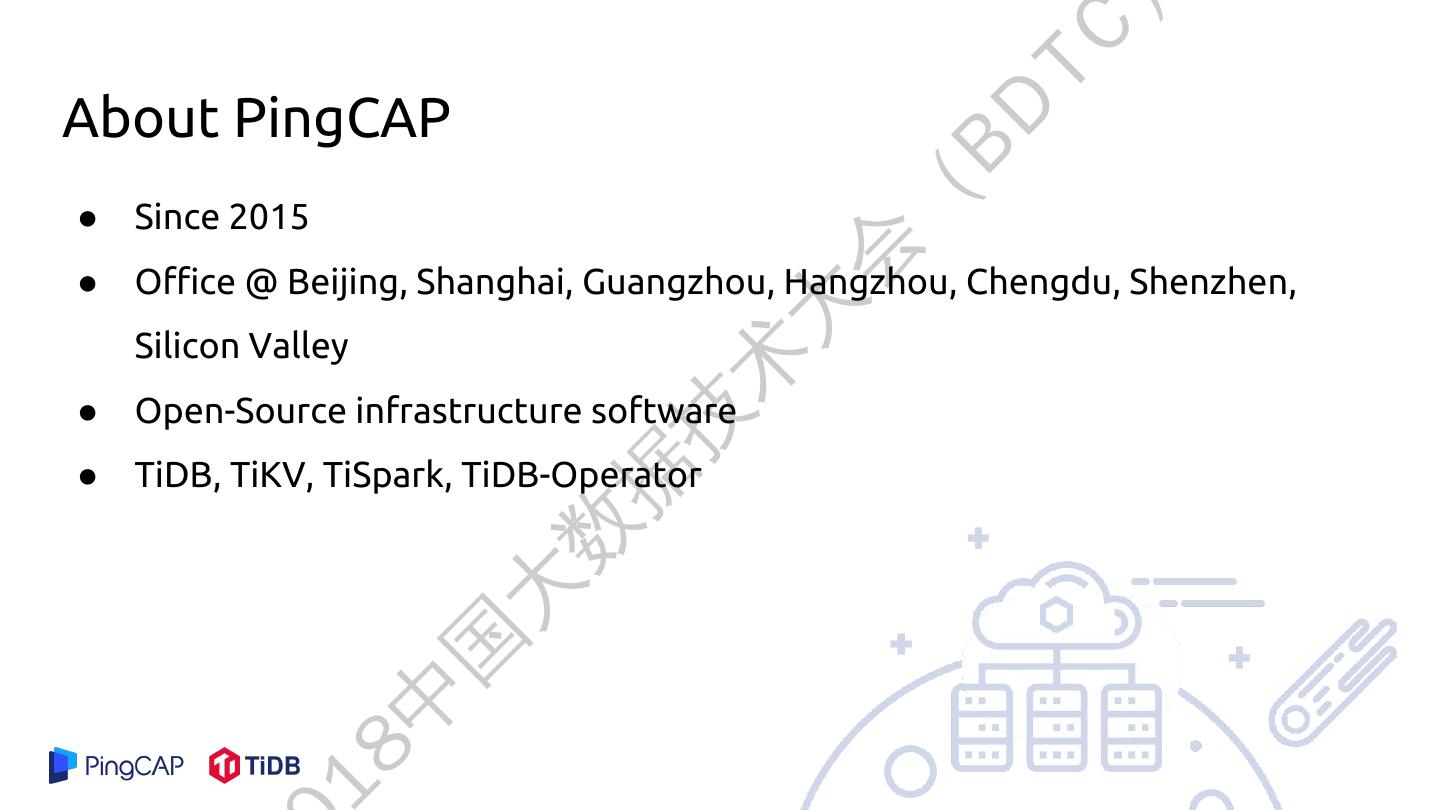 3 . TC About PingCAP BD ( ● Since 2015 会 ● Office @ Beijing, Shanghai, Guangzhou, Hangzhou, Chengdu, Shenzhen, 大 Silicon Valley 术 ● Open-Source infrastructure software 技 ● TiDB, TiKV, TiSpark, TiDB-Operator 据 数 大 国 8中