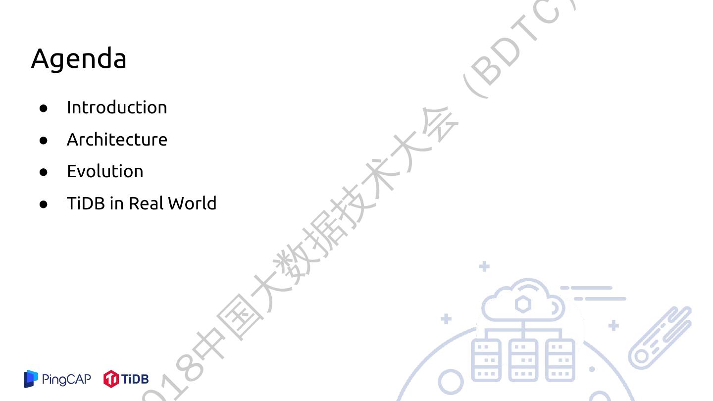 4 . TC Agenda BD ( ● Introduction 会 ● Architecture 大 ● Evolution 术 ● TiDB in Real World 技 据 数 大 国 8中