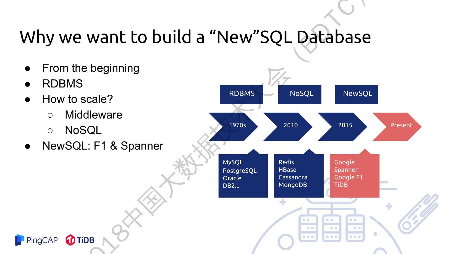 6 . TC Why we want to build a “New”SQL Database BD ( ● From the beginning 会 ● RDBMS RDBMS NoSQL NewSQL 大 ● How to scale? 术 ○ Middleware 1970s 2010 2015 Present ○ NoSQL 技 ● NewSQL: F1 & Spanner 据 MySQL Redis Google 数 PostgreSQL HBase Spanner Oracle Cassandra Google F1 大 DB2... MongoDB TiDB 国 8中