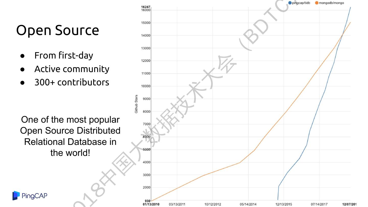 8 . TC Open Source BD ( ● From first-day 会 ● Active community 大 ● 300+ contributors 术 技 One of the most popular 据 Open Source Distributed Relational Database in 数 大 the world! 国 8中 PingCAP.com