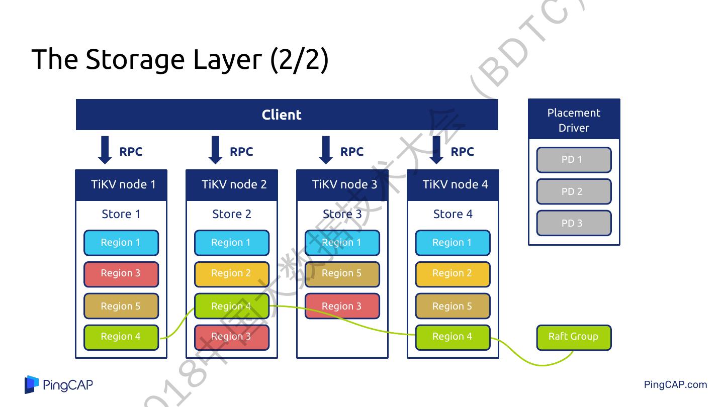 13 . TC The Storage Layer (2/2) BD ( Client Placement 会 Driver RPC RPC RPC RPC 大 PD 1 术 TiKV node 1 TiKV node 2 TiKV node 3 TiKV node 4 PD 2 技 Store 1 Store 2 Store 3 Store 4 PD 3 据 Region 1 Region 1 Region 1 Region 1 Region 3 Region 2 数 Region 5 Region 2 大 Region 5 Region 4 Region 3 Region 5 国 Region 4 Region 3 Region 4 Raft Group 8中 PingCAP.com